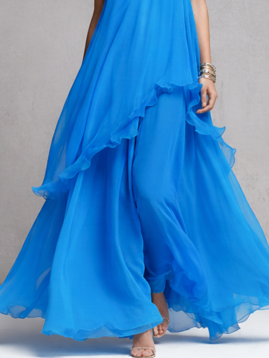 This elegant blue maxi dress features a flowing chiffon design with layered ruffles and slim spaghetti straps. It creates a graceful look that is perfect for special events and warm-weather occasions.