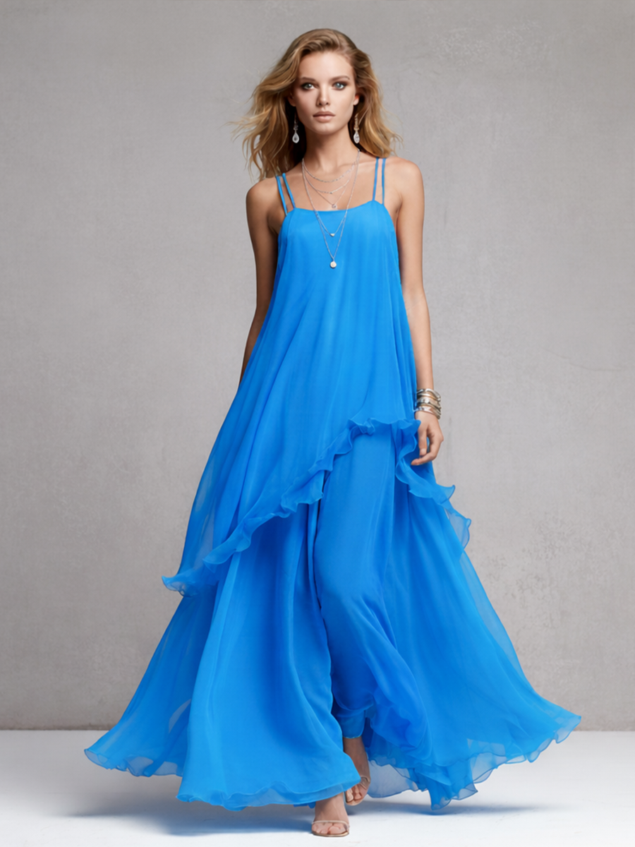 Women’s Elegant Blue Chiffon Layered Ruffle Spaghetti Strap Maxi Dress