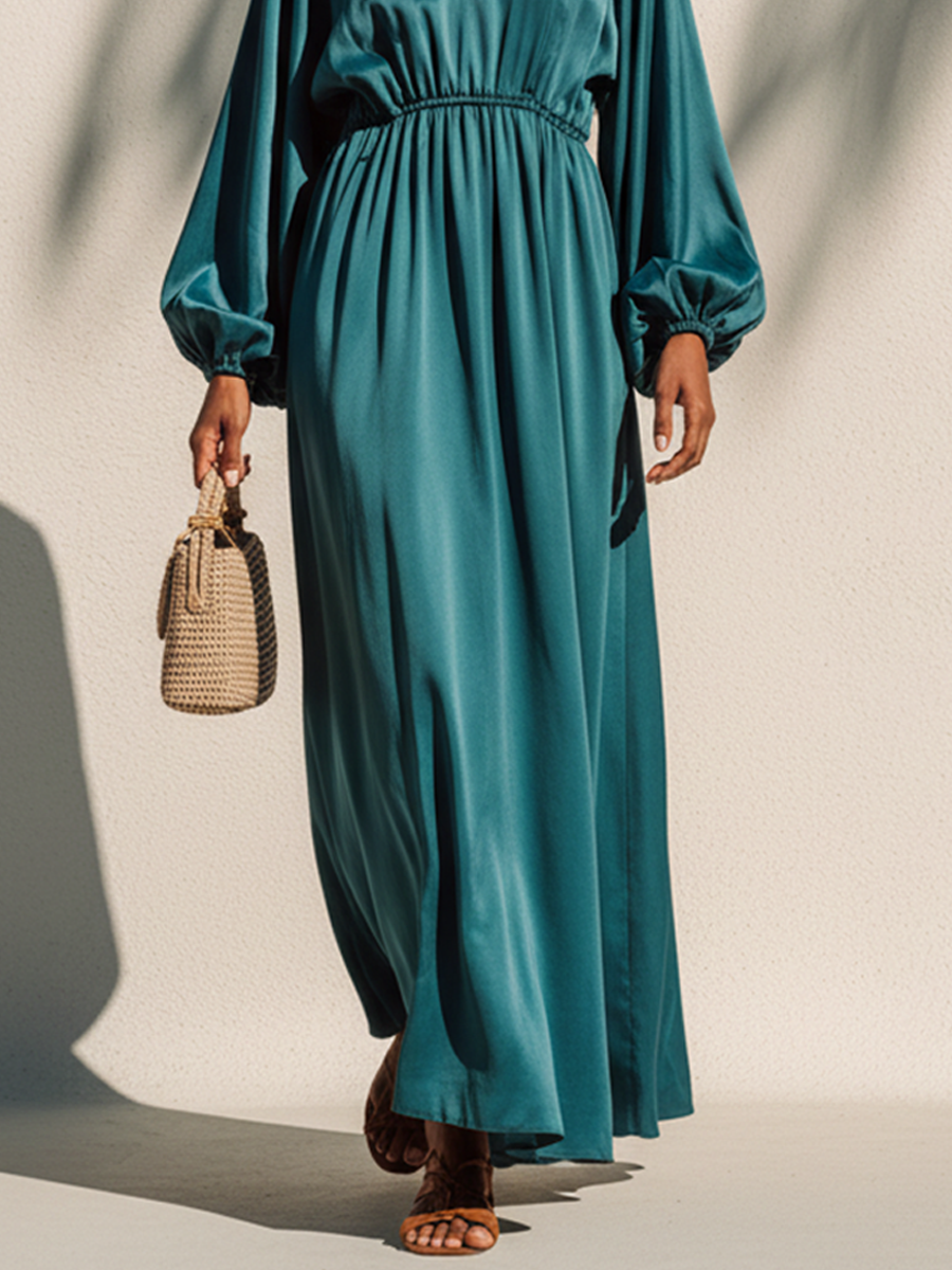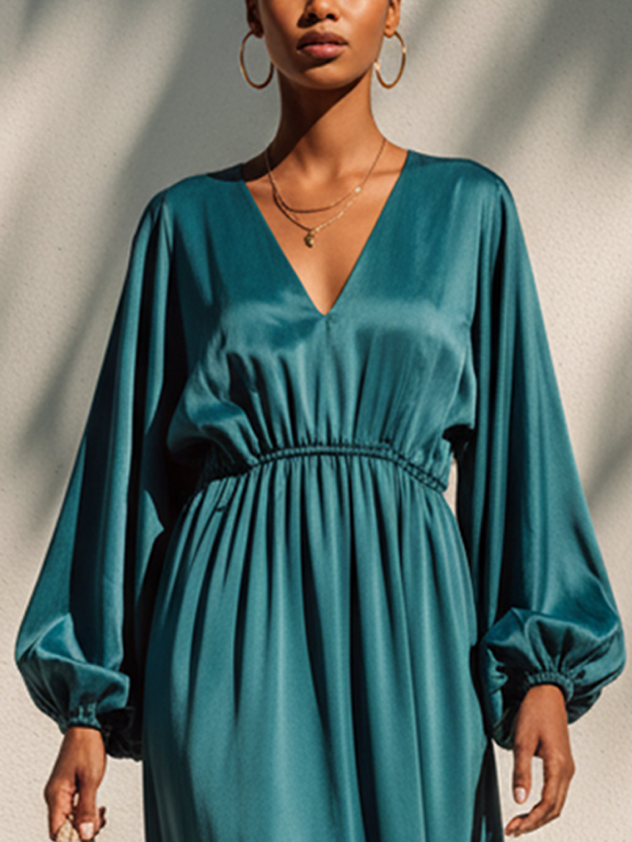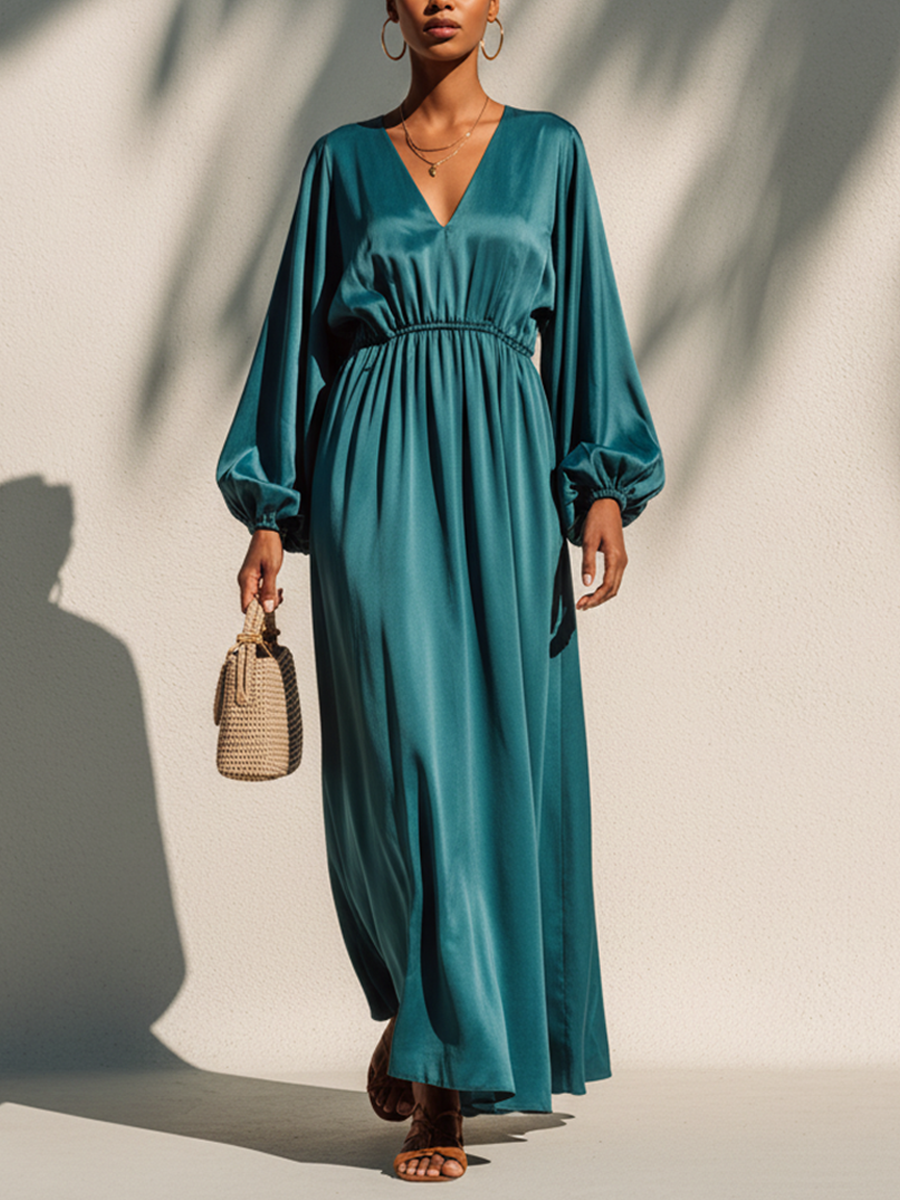 This elegant long dress features a smooth satin finish, a flattering V-neckline, and flowing lantern sleeves. Its relaxed drape and refined color create a graceful look for formal and special occasions.