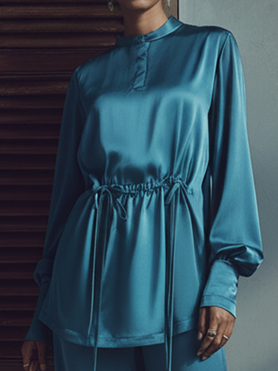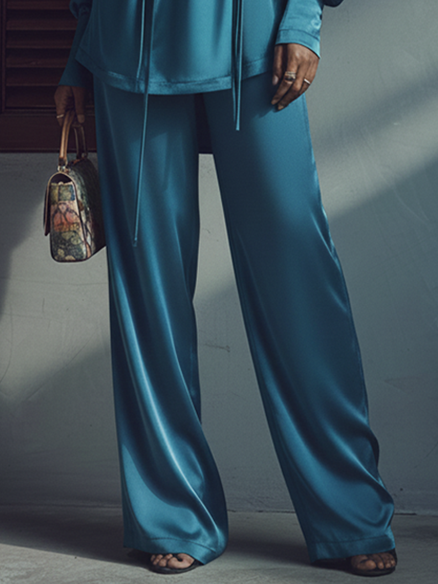 Women’s Elegant Blue Satin Drawstring Top And Wide-Leg Pants Set