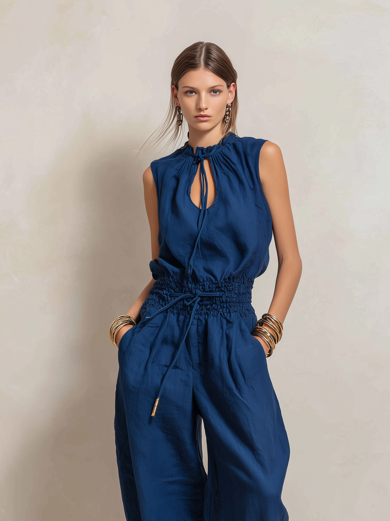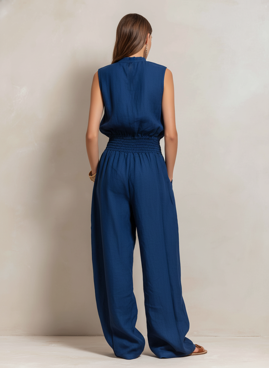 An elegant jumpsuit crafted from a breathable cotton-linen blend in a rich dark blue tone. Featuring a classic round neckline and sleeveless design, the streamlined silhouette offers a refined yet comfortable look, perfect for both casual elegance and semi-formal occasions.