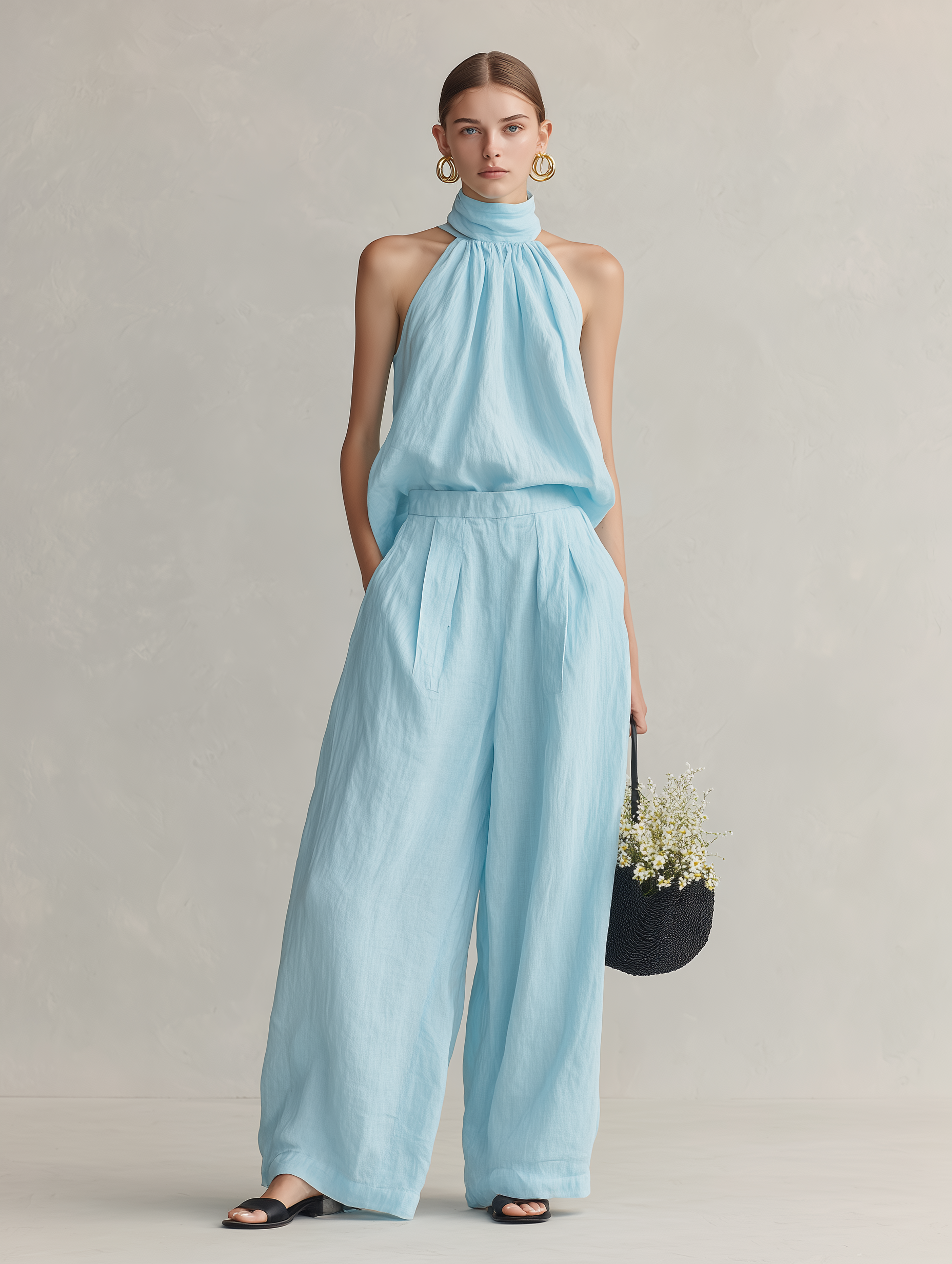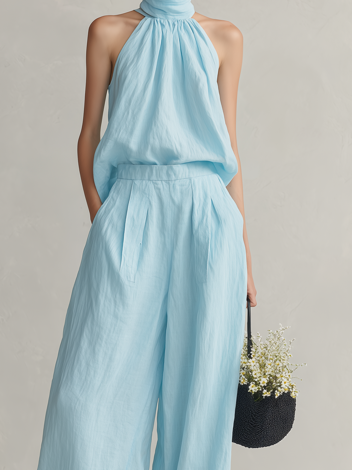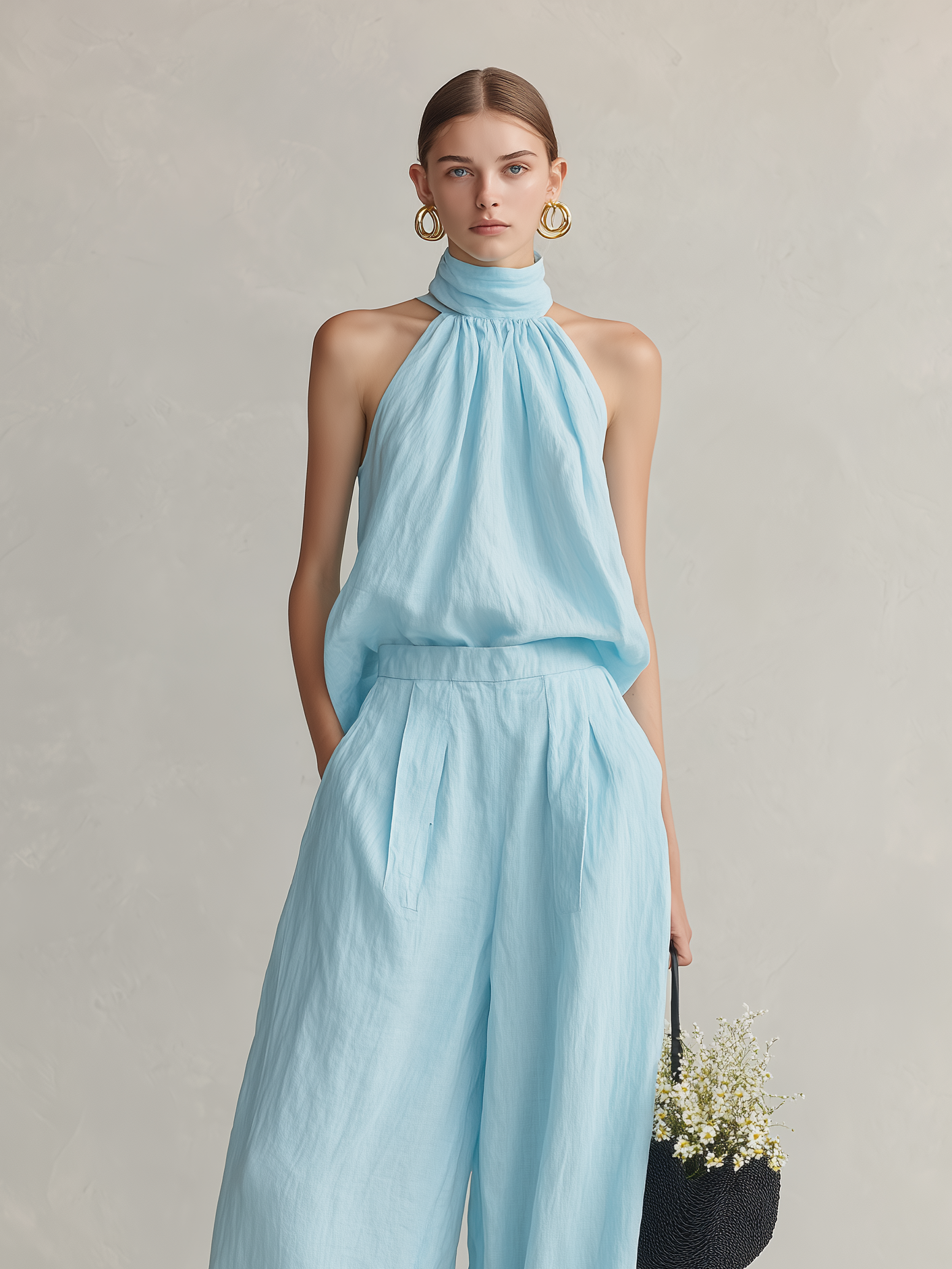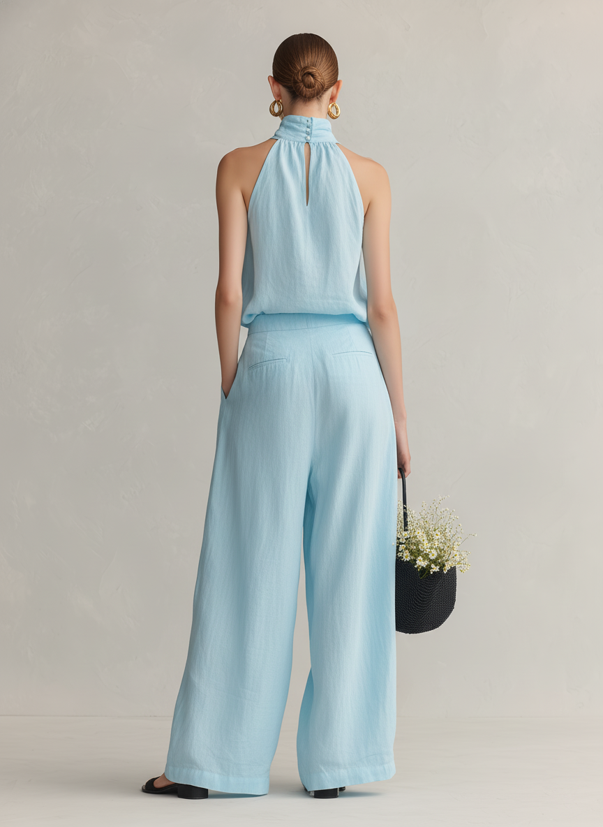 An elegant two-piece set crafted from a breathable cotton-linen blend in a soft light blue tone. Featuring a classic round-neck sleeveless top paired with matching trousers, this outfit offers a clean and refined silhouette with a comfortable, airy feel—perfect for warm-weather styling.