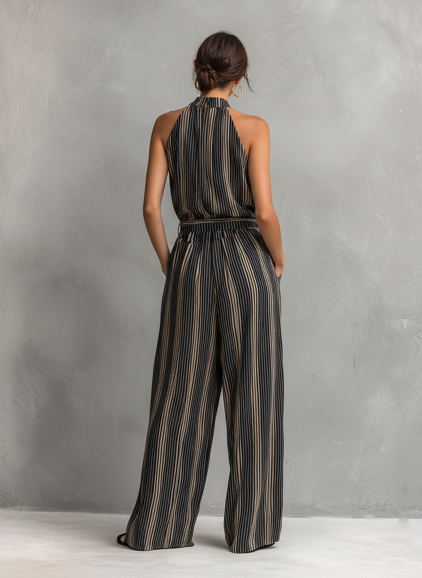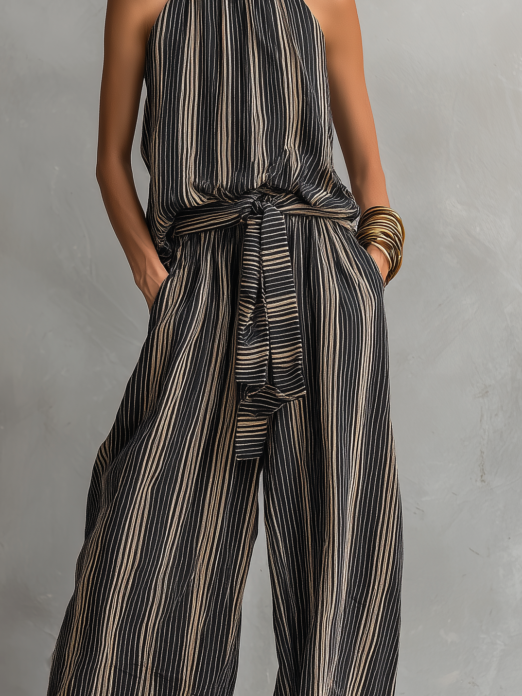 A sophisticated two-piece set featuring a striped printed woven sleeveless top with a classic round neckline, paired with coordinating trousers. Designed for effortless elegance and modern refinement, this set offers a polished yet comfortable silhouette.