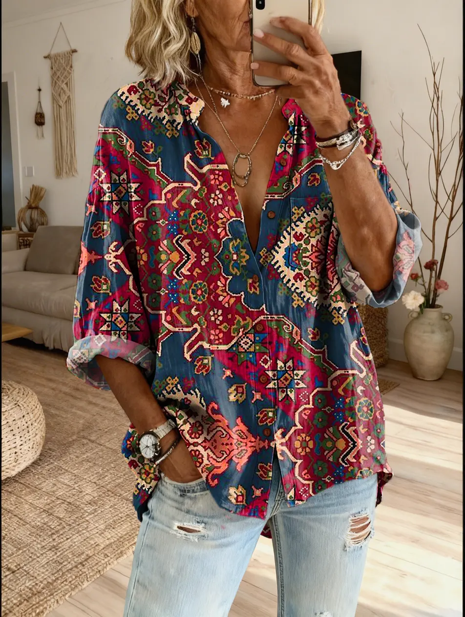 Women's Ethnic Floral Pattern Art Print Casual Cotton-Linen Blend Shirt