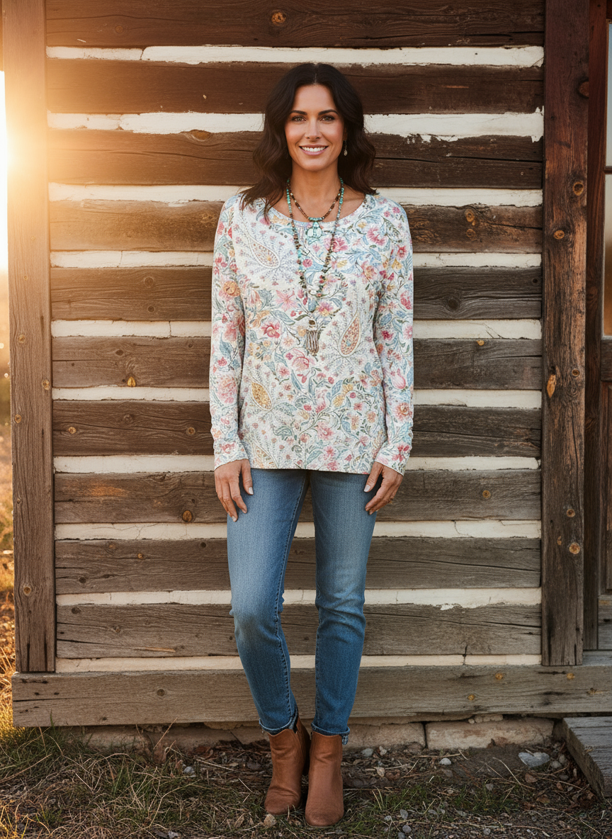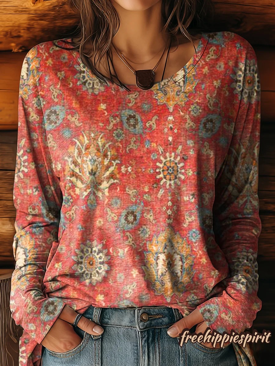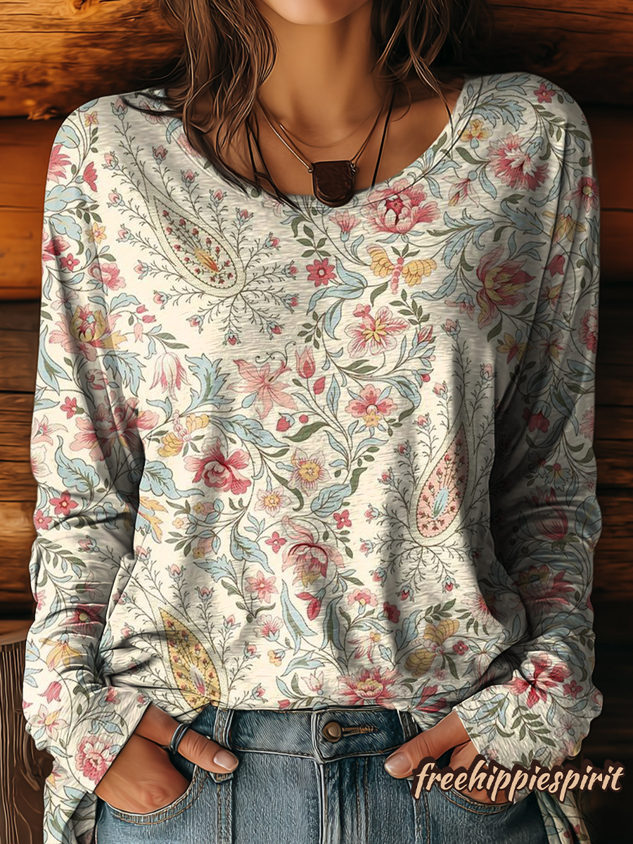 Women's Ethnic Paisley Art Print Casual Crew Neck Long Sleeve T-shirt