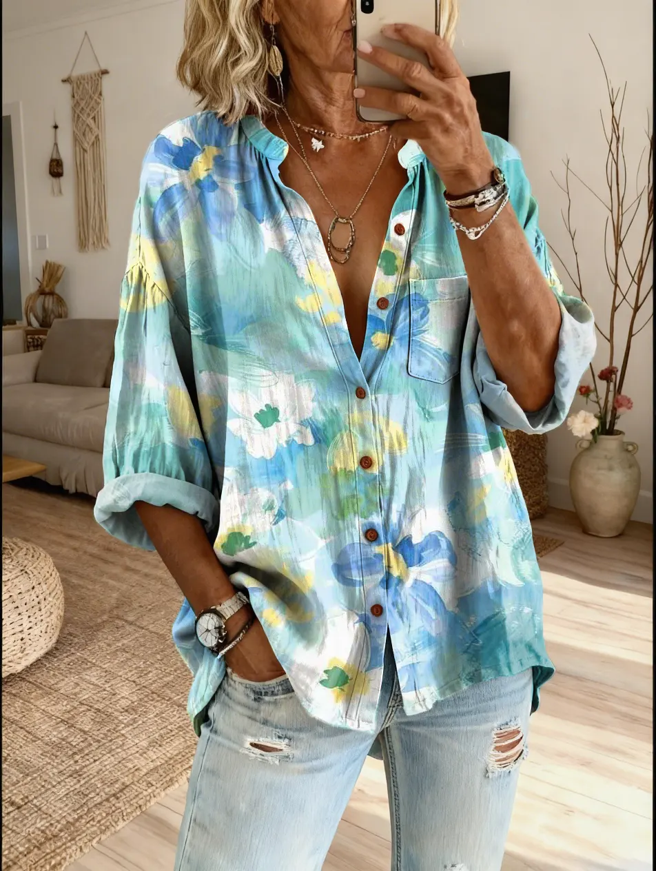 Women's Floral Art Print Casual Cotton-linen Blend Shirt