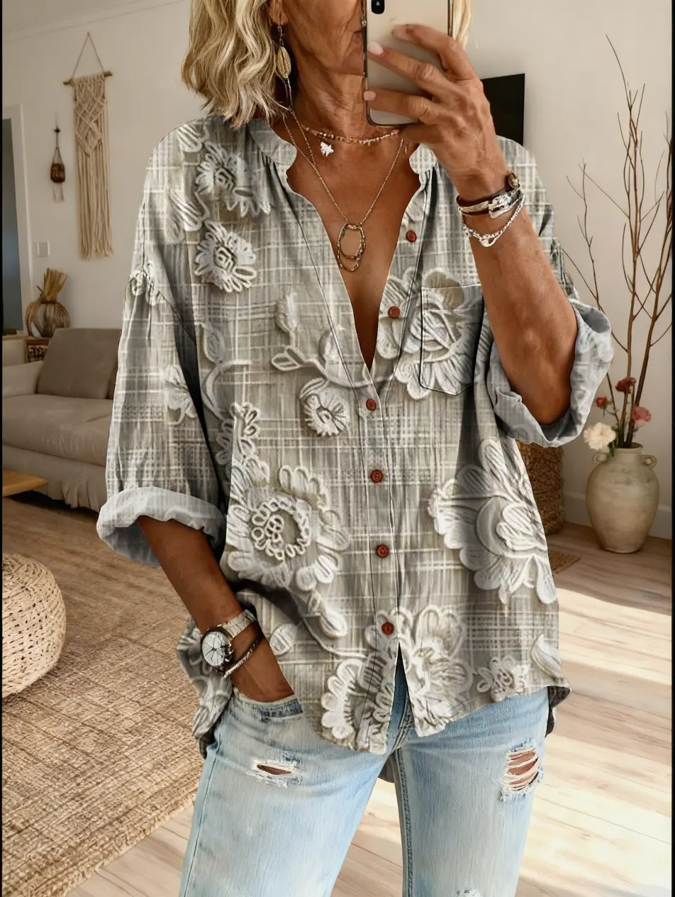 Women's Floral Art Print Casual Cotton-linen Blend Shirt