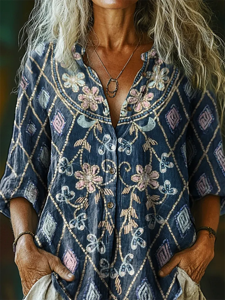 Women's Floral Art Print Casual Cotton-linen Blend Shirt