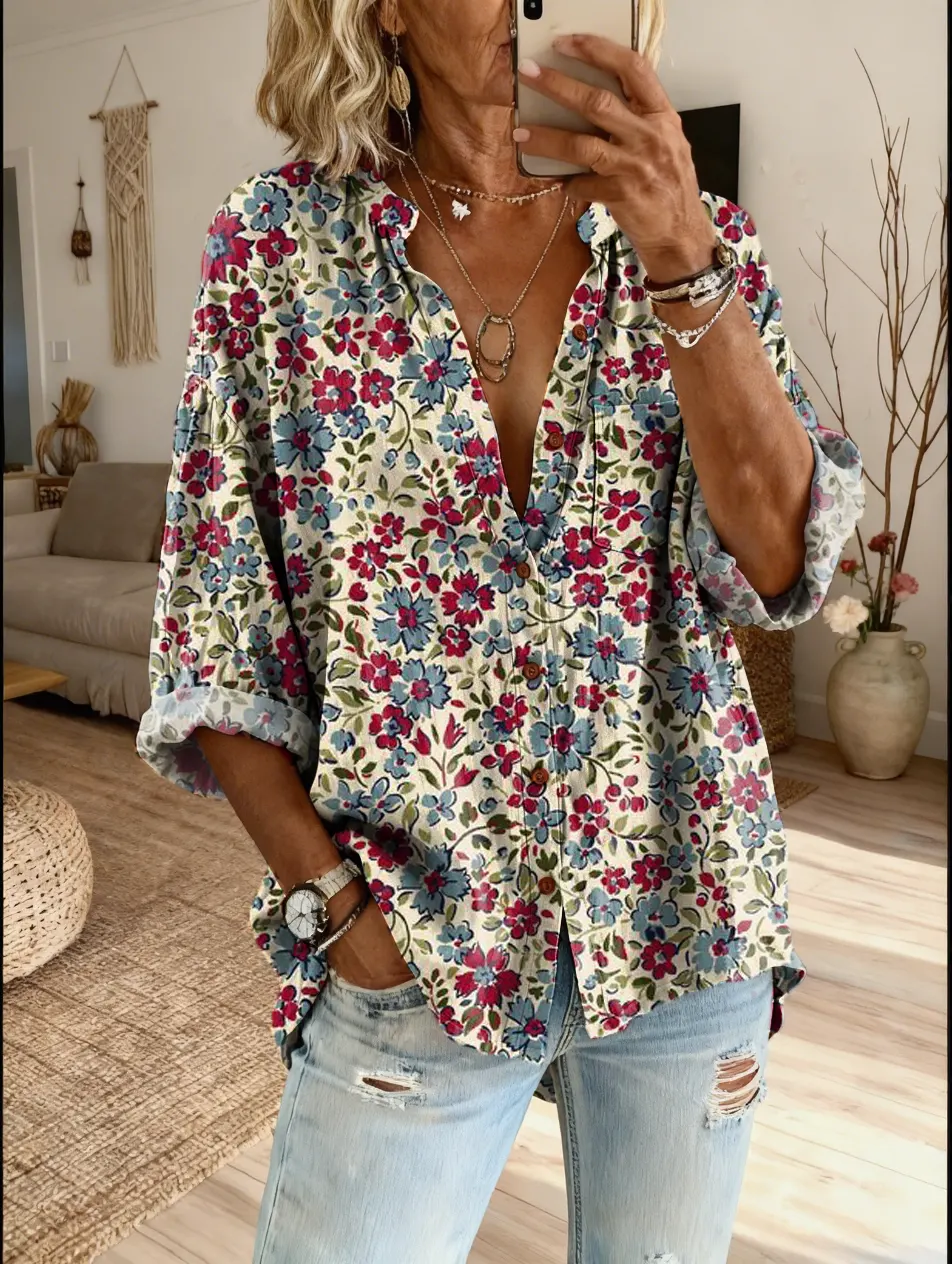 Women's Floral Art Print Casual Cotton-linen Blend Shirt