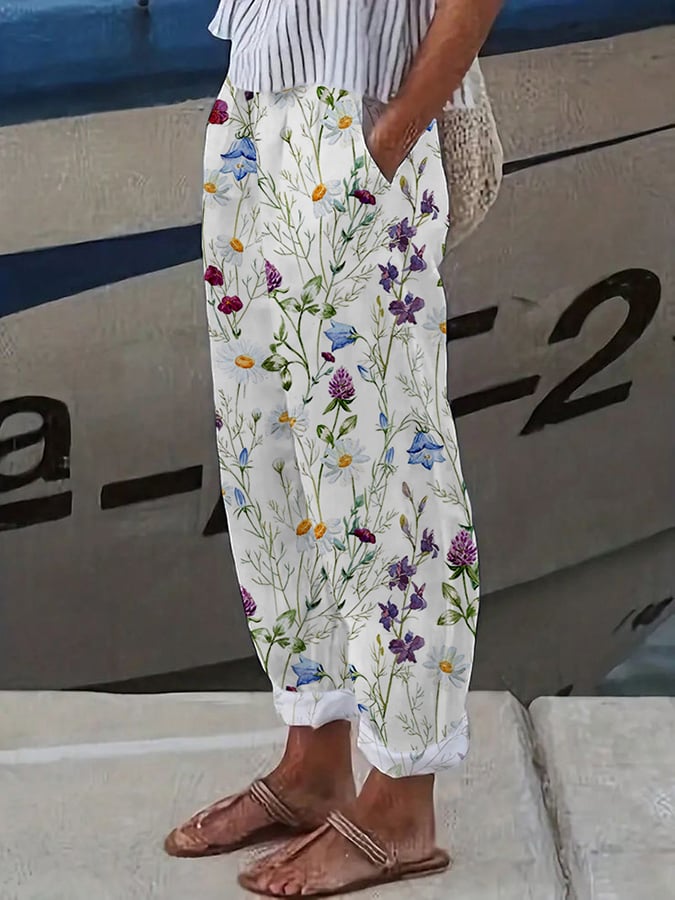 Women's Floral Design Print Lace-Up Loose With Elastic Waist Casual Pants