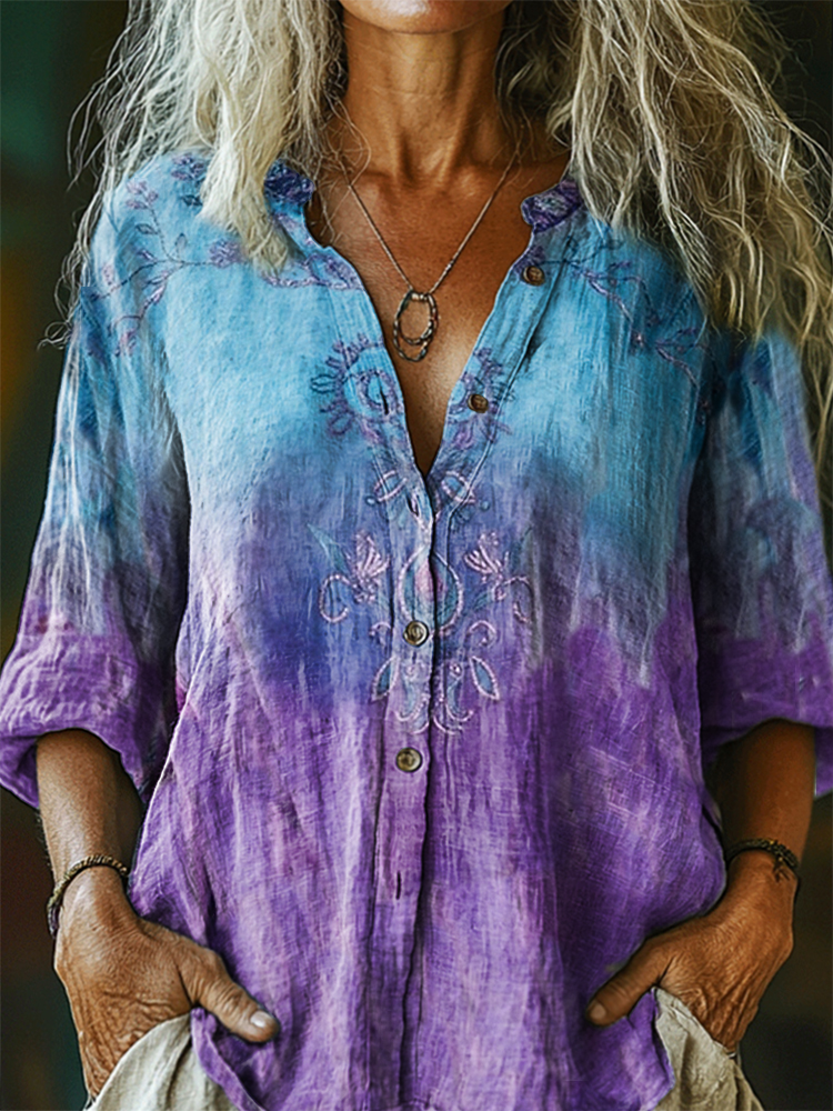 Women's Floral Pattern Art Print Casual Cotton Linen Shirt