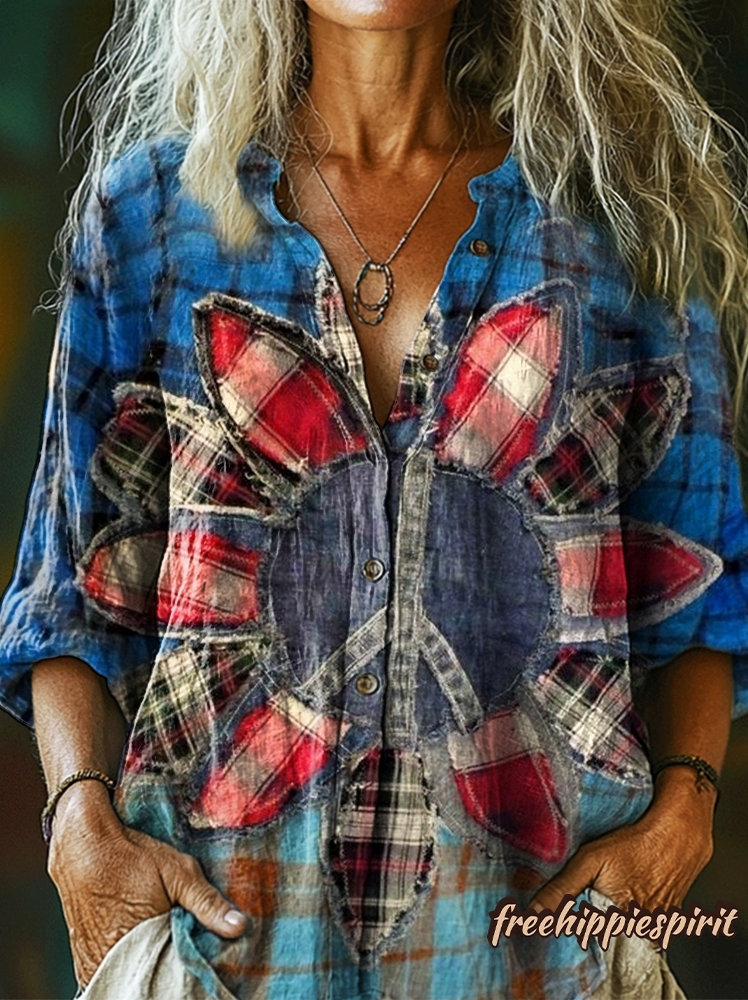 Women's Hippie Peace Floral Patchwork Art Pattern Print Casual Cotton Linen Shirt