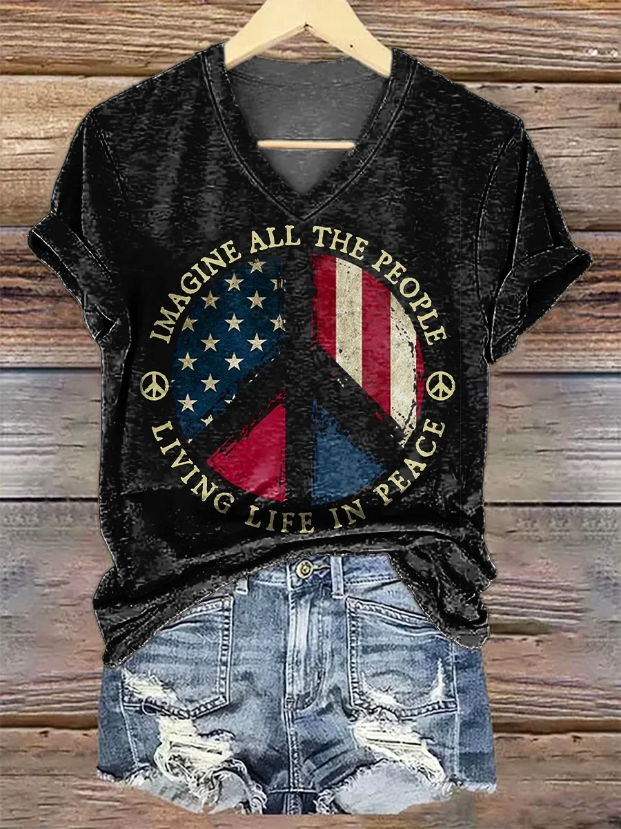 Women's Hippie Peace Patriotic Flag Print Crew Neck T-shirt