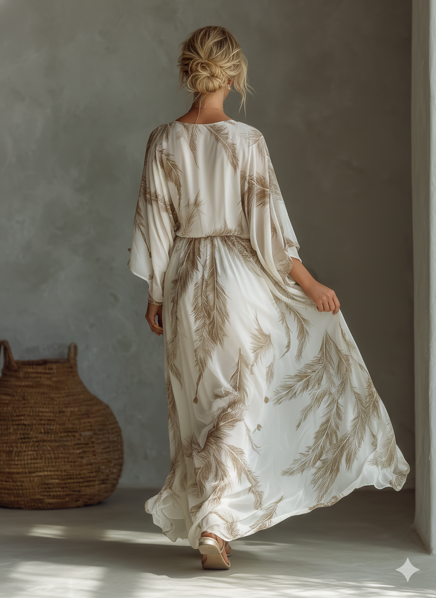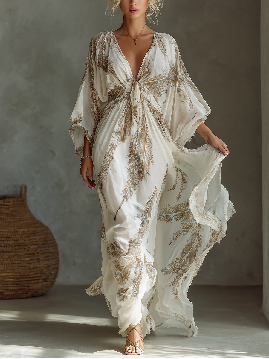 Women's Ivory And Taupe Chiffon Fabric Dolman Sleeve Maxi Dress With Twist Front & Palm Leaf Print