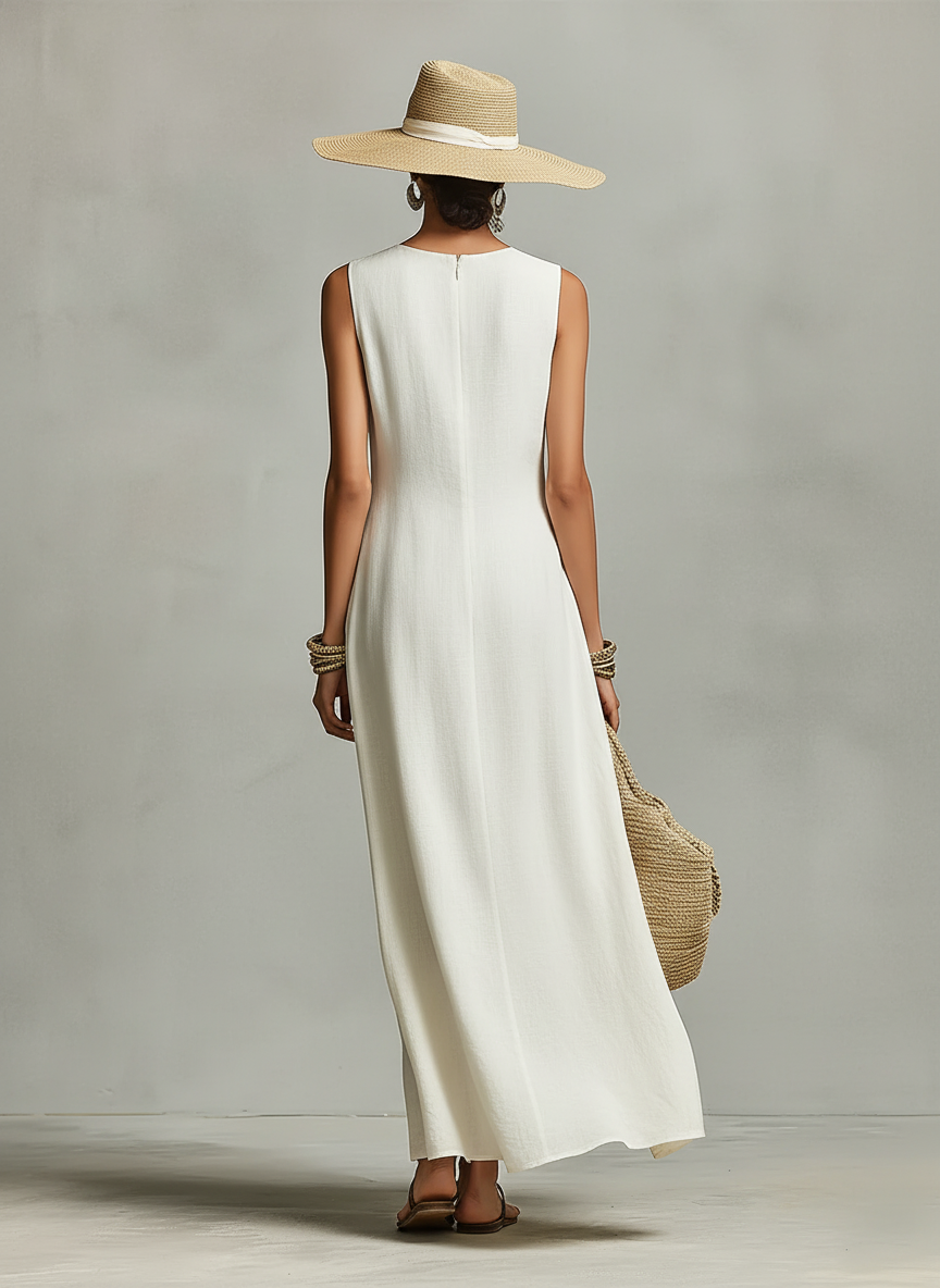 A breathable ivory linen dress with a sleeveless design and an asymmetric hem. It offers a contemporary casual-feminine look with a flowing, draped front detail.