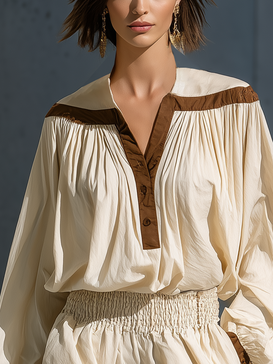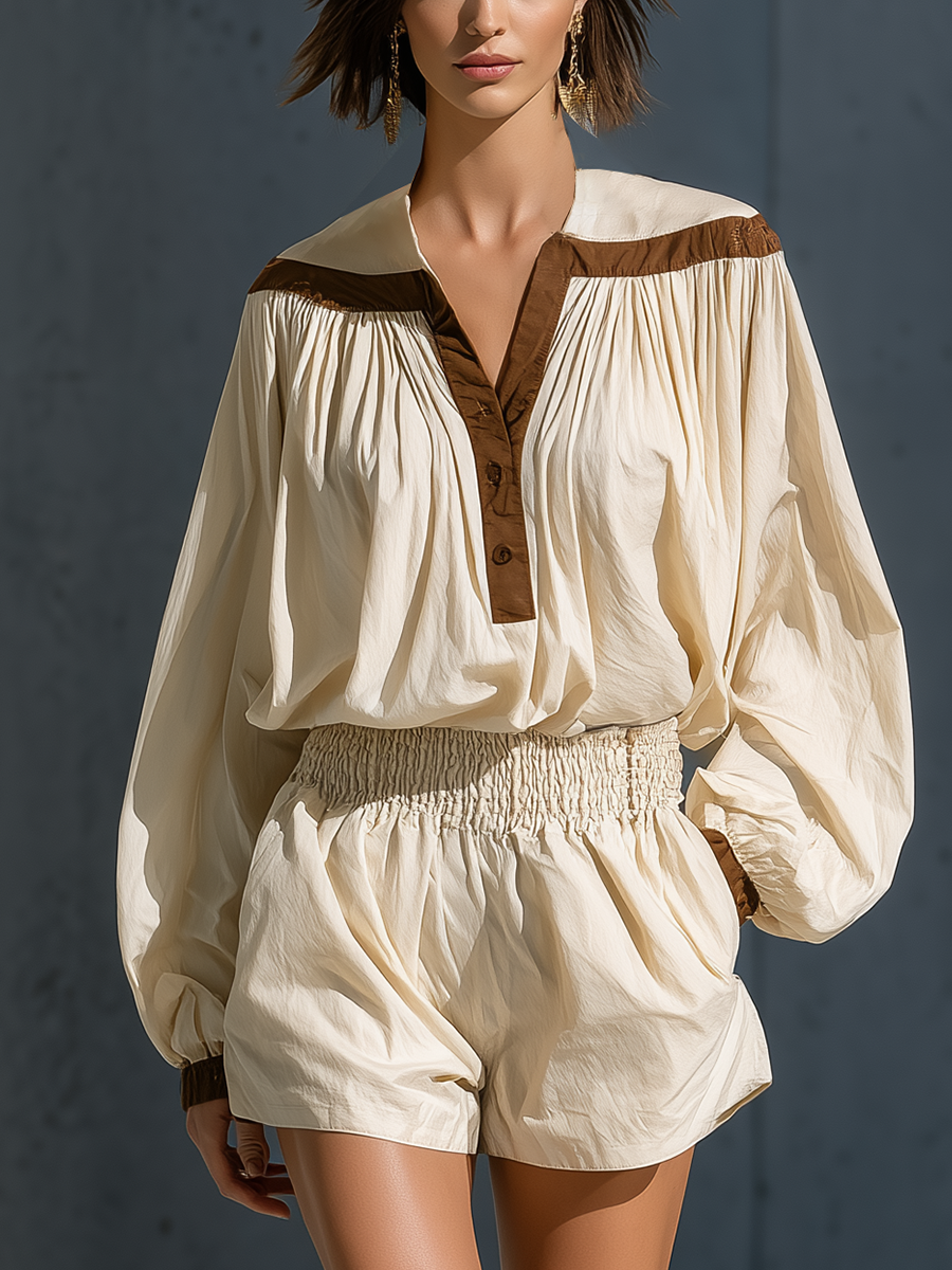 Women’s Ivory Linen-Blend Long-Sleeve Jumpsuit With Contrast Trim And Elastic Waist