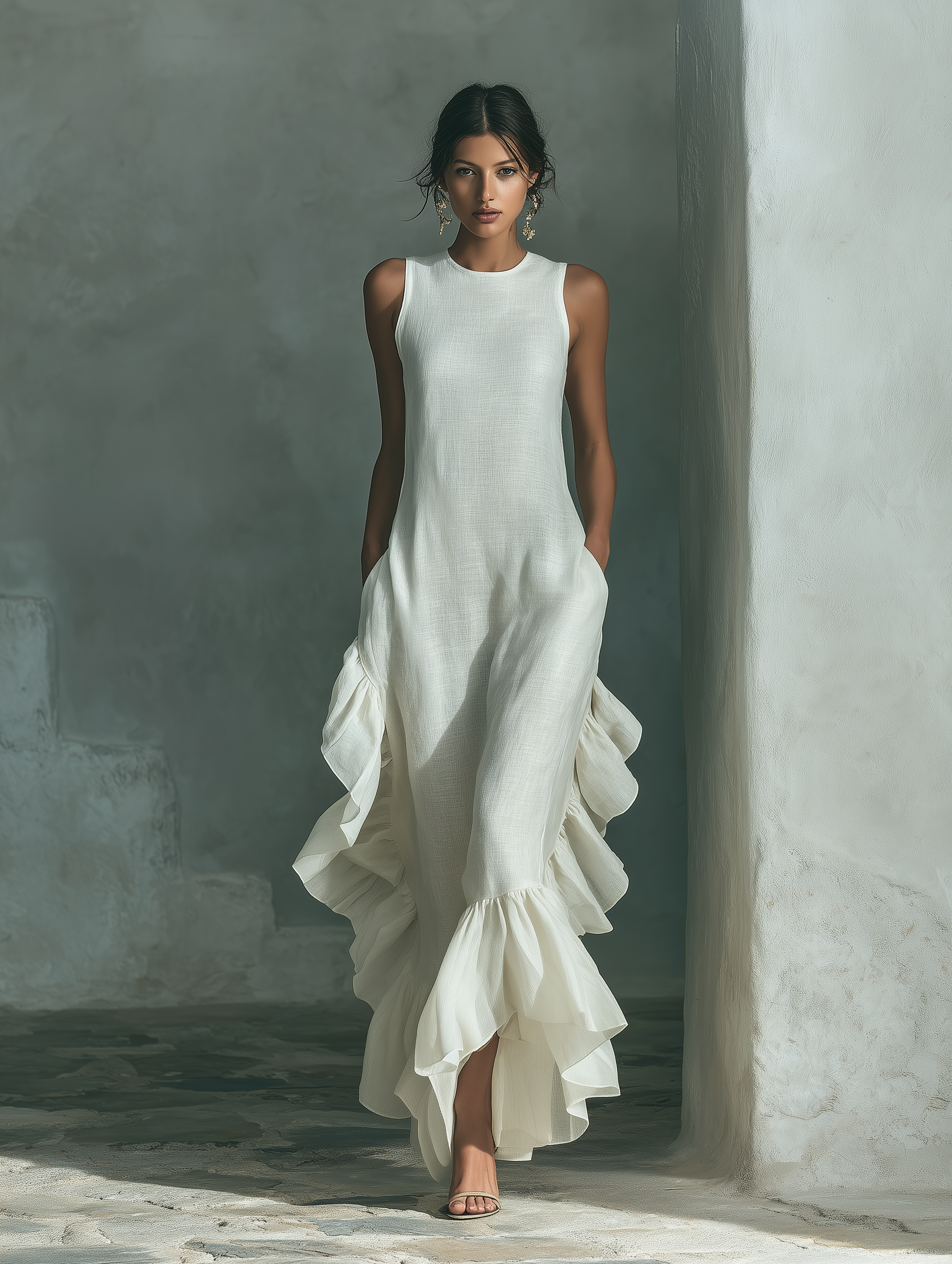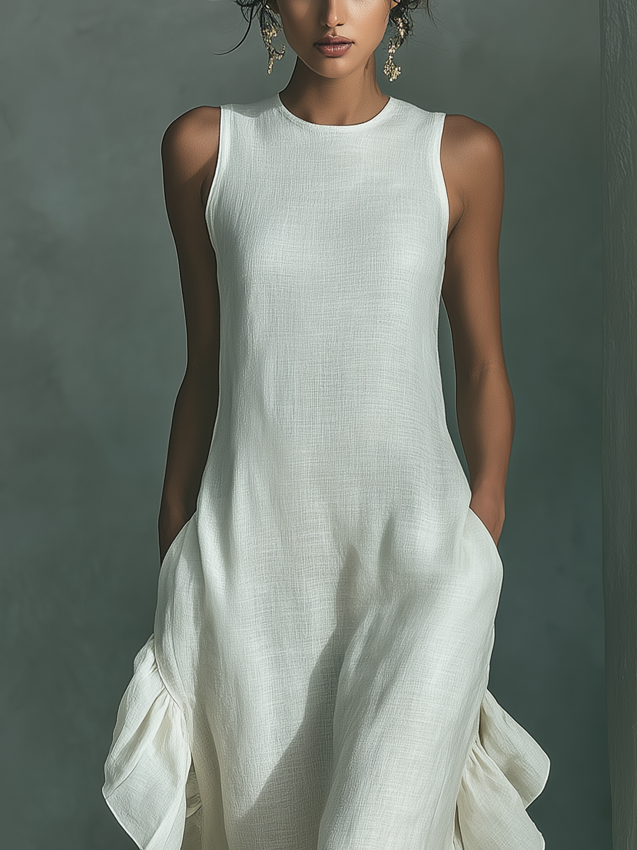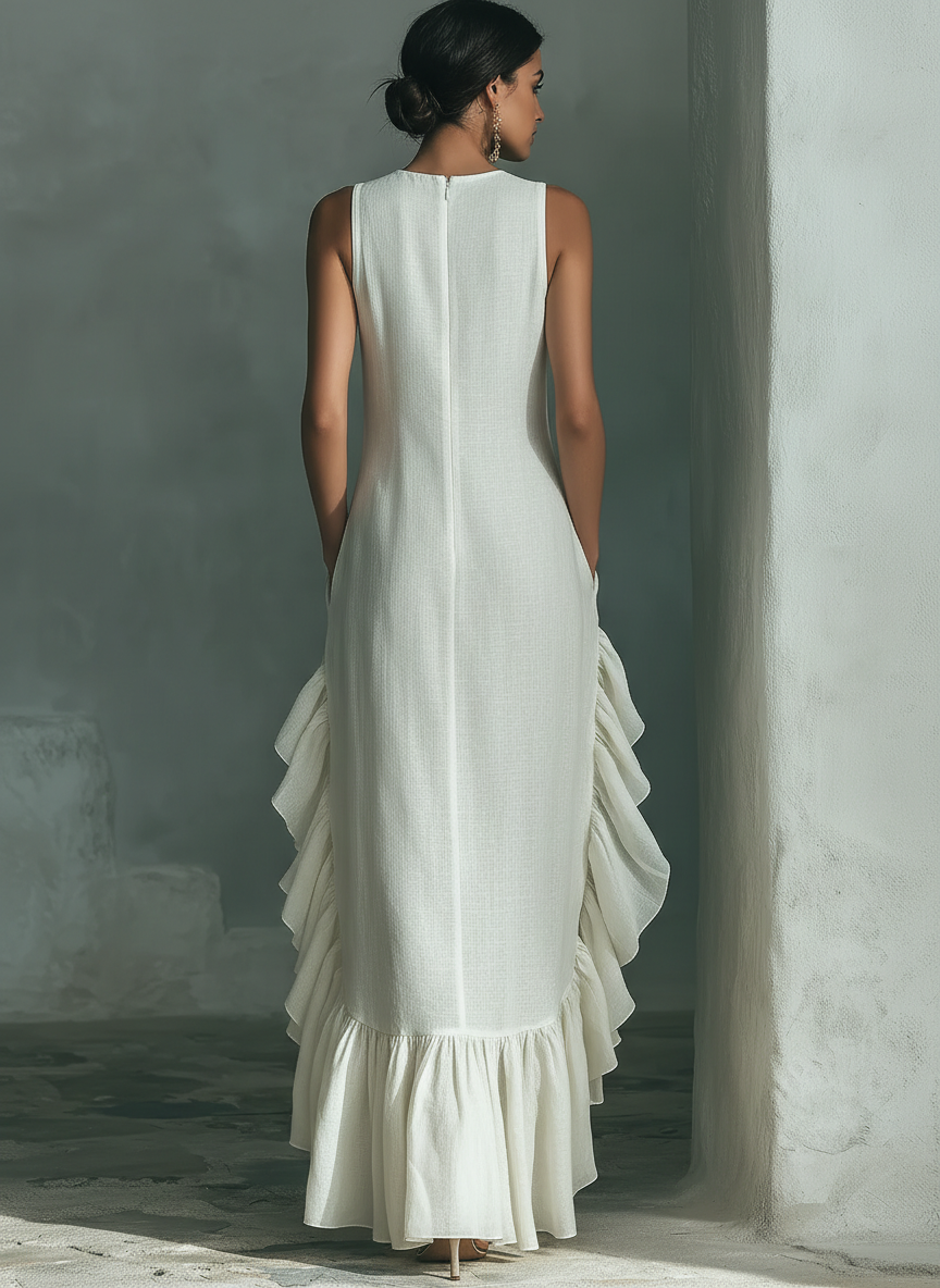 Women's Ivory Linen Fabric Sleeveless Maxi Dress With Round Neck & Ruffle Hem