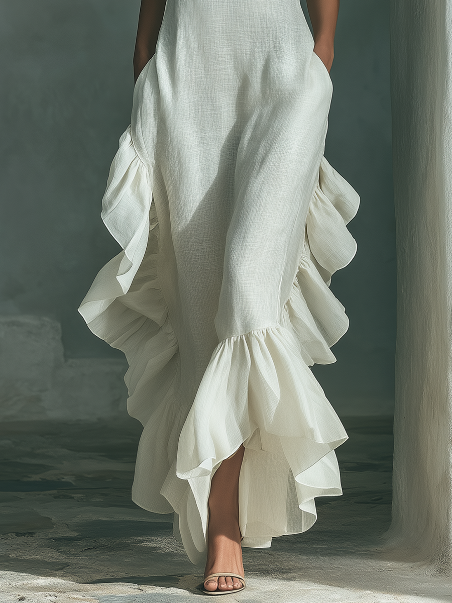 A pure ivory linen maxi dress with a round neck and layered ruffle hem for a soft, buoyant look.