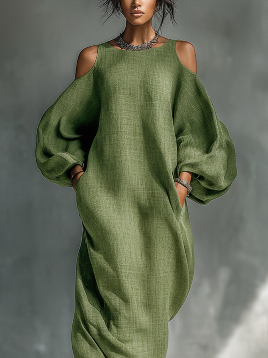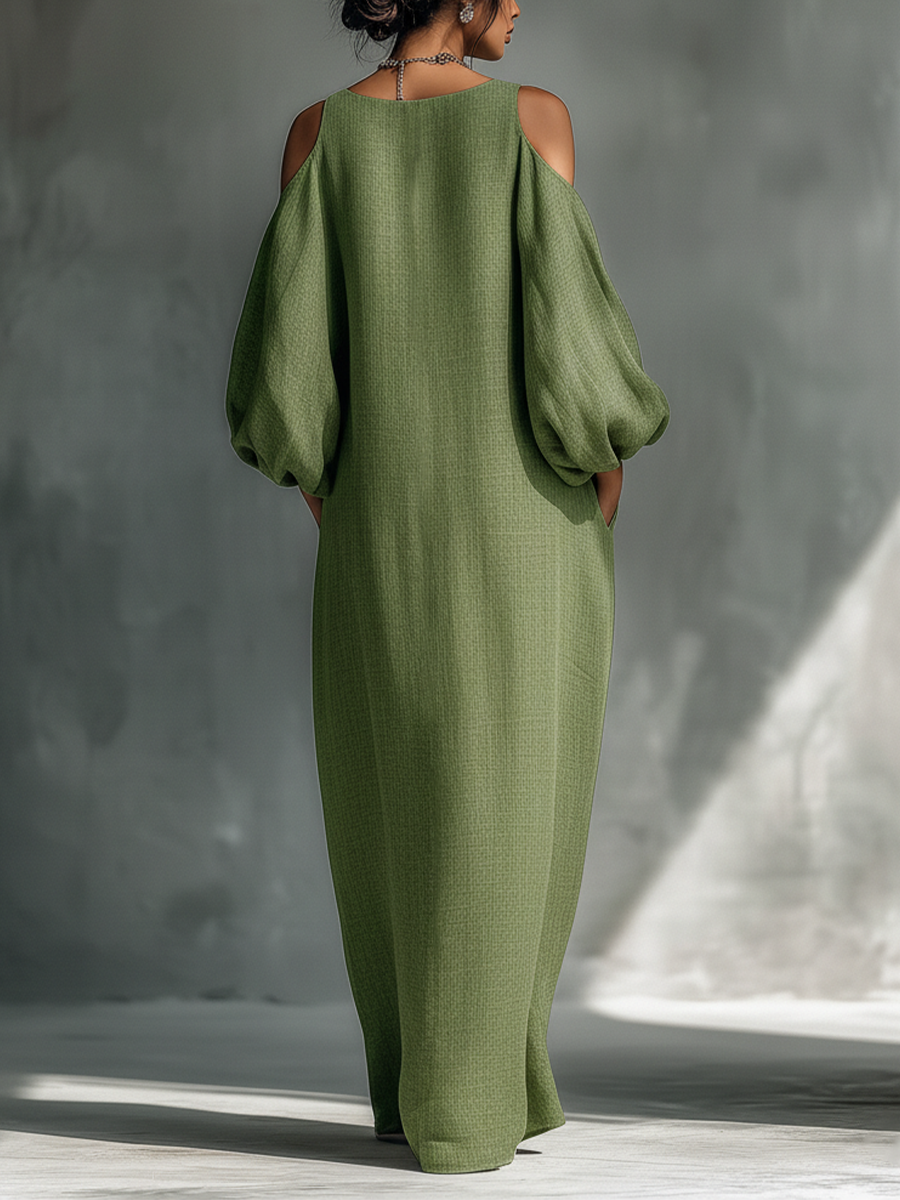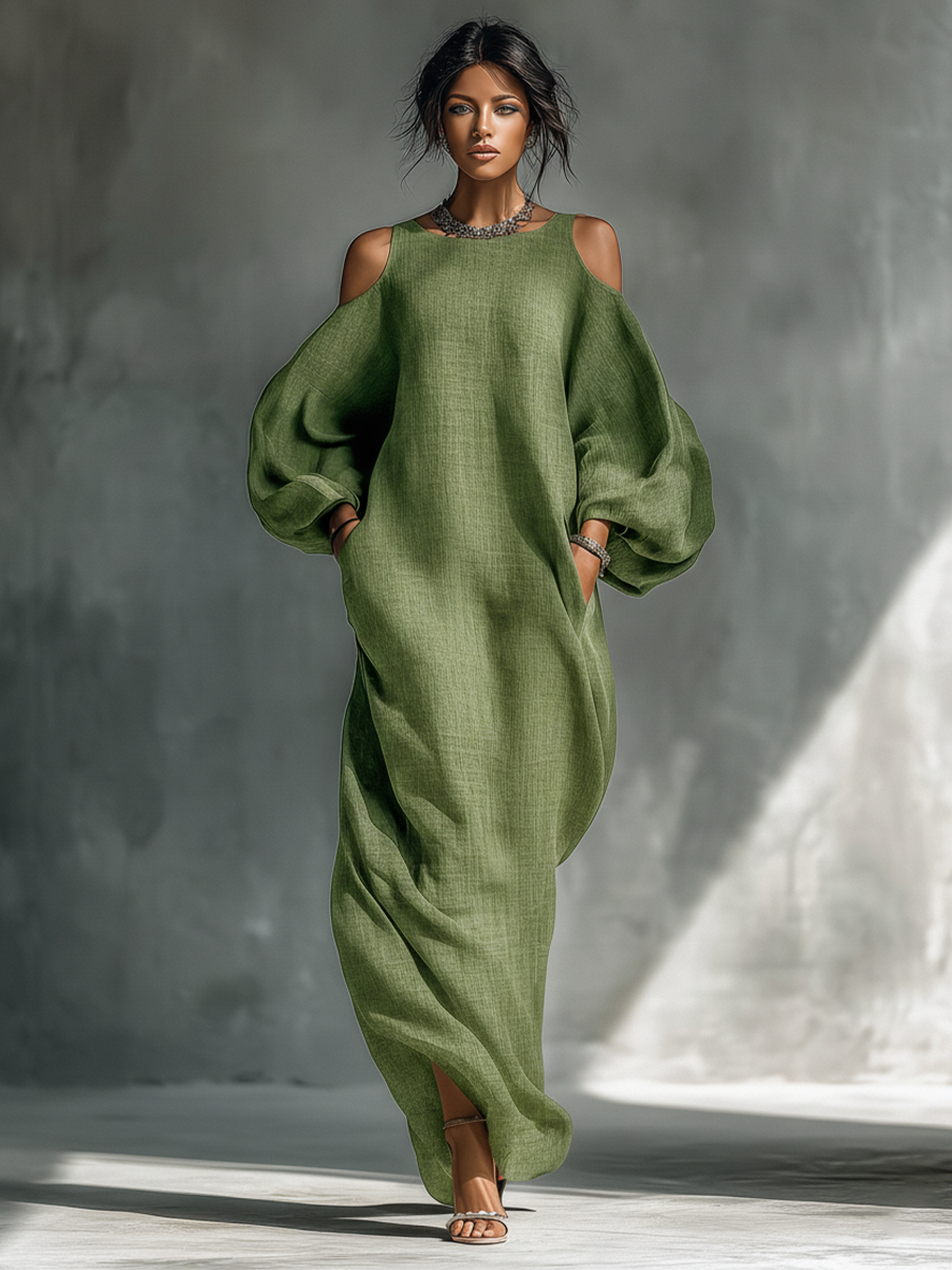 A flowing light green maxi dress with open shoulders, oversized puff sleeves, and handy side pockets for a chic, relaxed look.