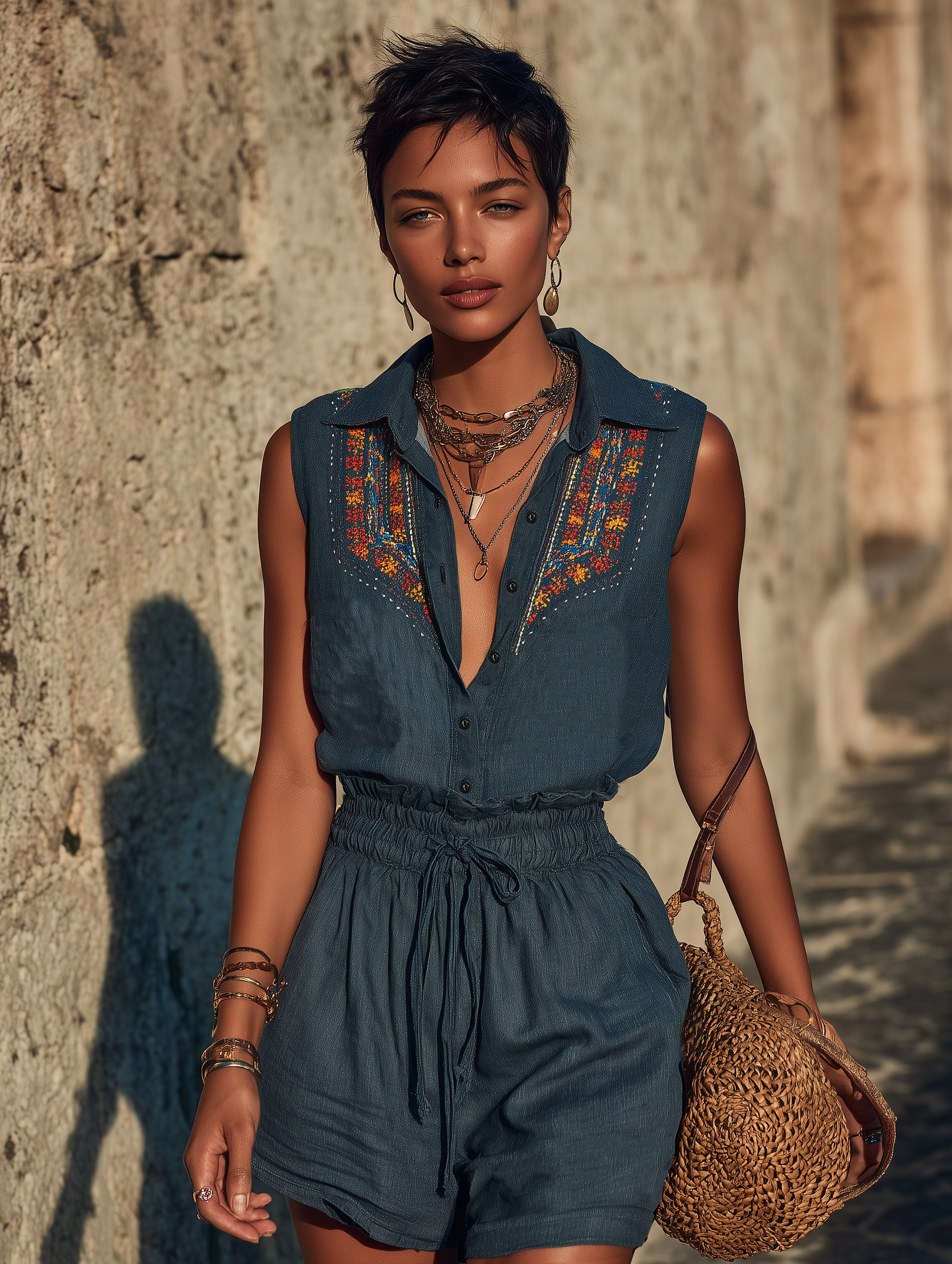 A chic and effortlessly stylish minimalist romper crafted from a lightweight and breathable linen blend. This versatile one-piece features a classic collared neckline, a breezy sleeveless design, and delicate embroidery that adds a unique touch of refined artistry. An adjustable drawstring waist ensures a flattering and comfortable fit, making it perfect for warm-weather days and various occasions.