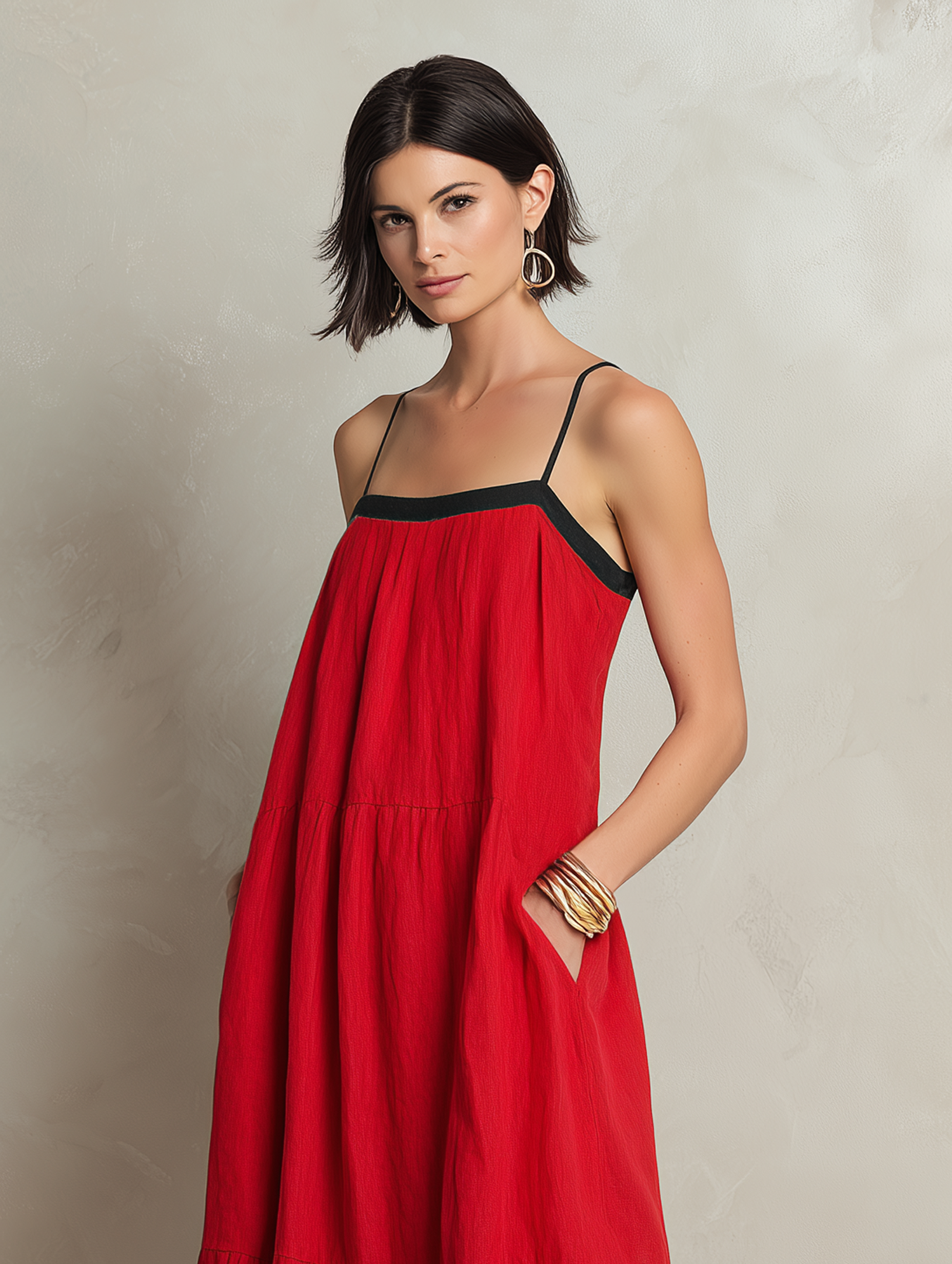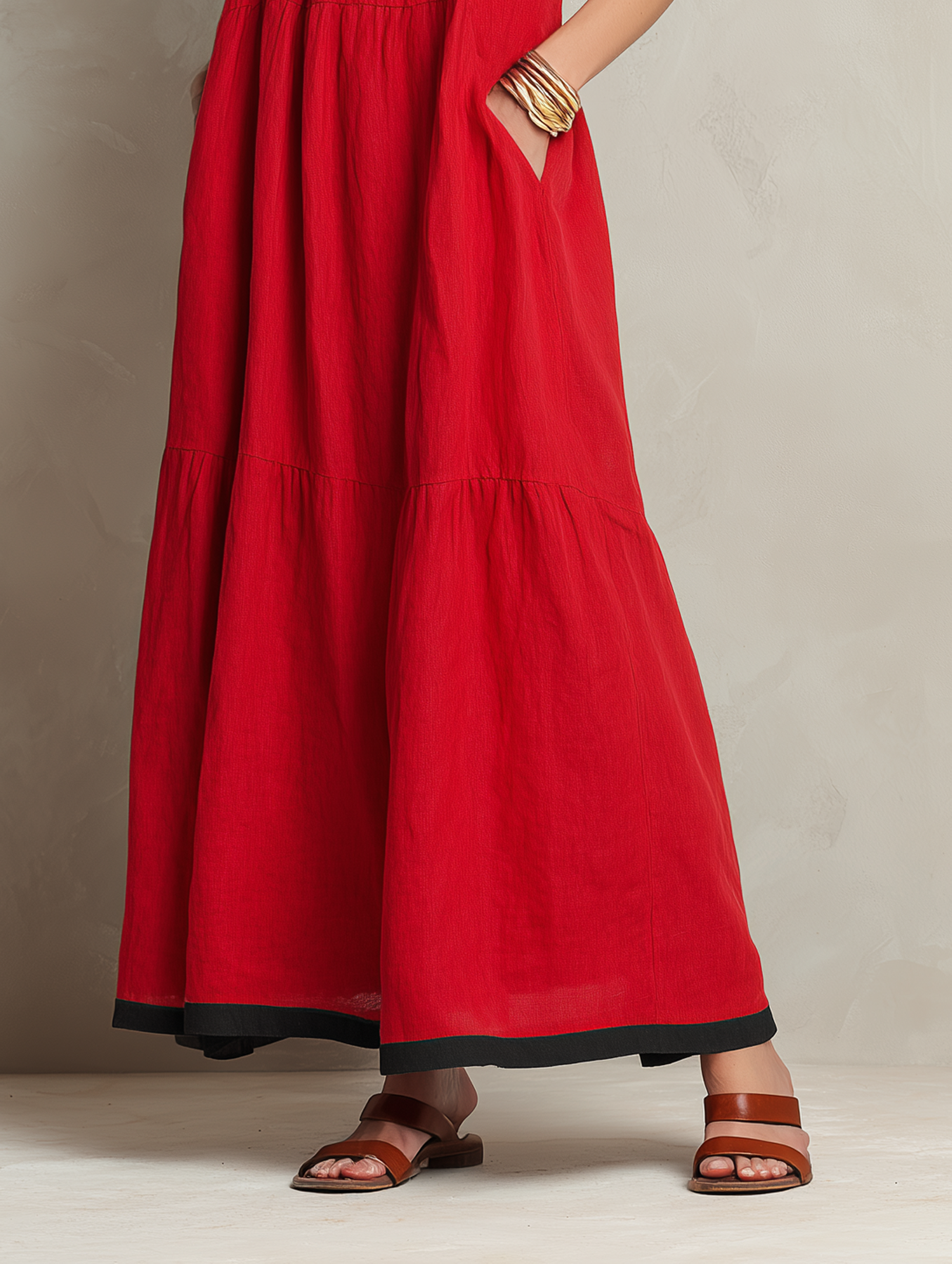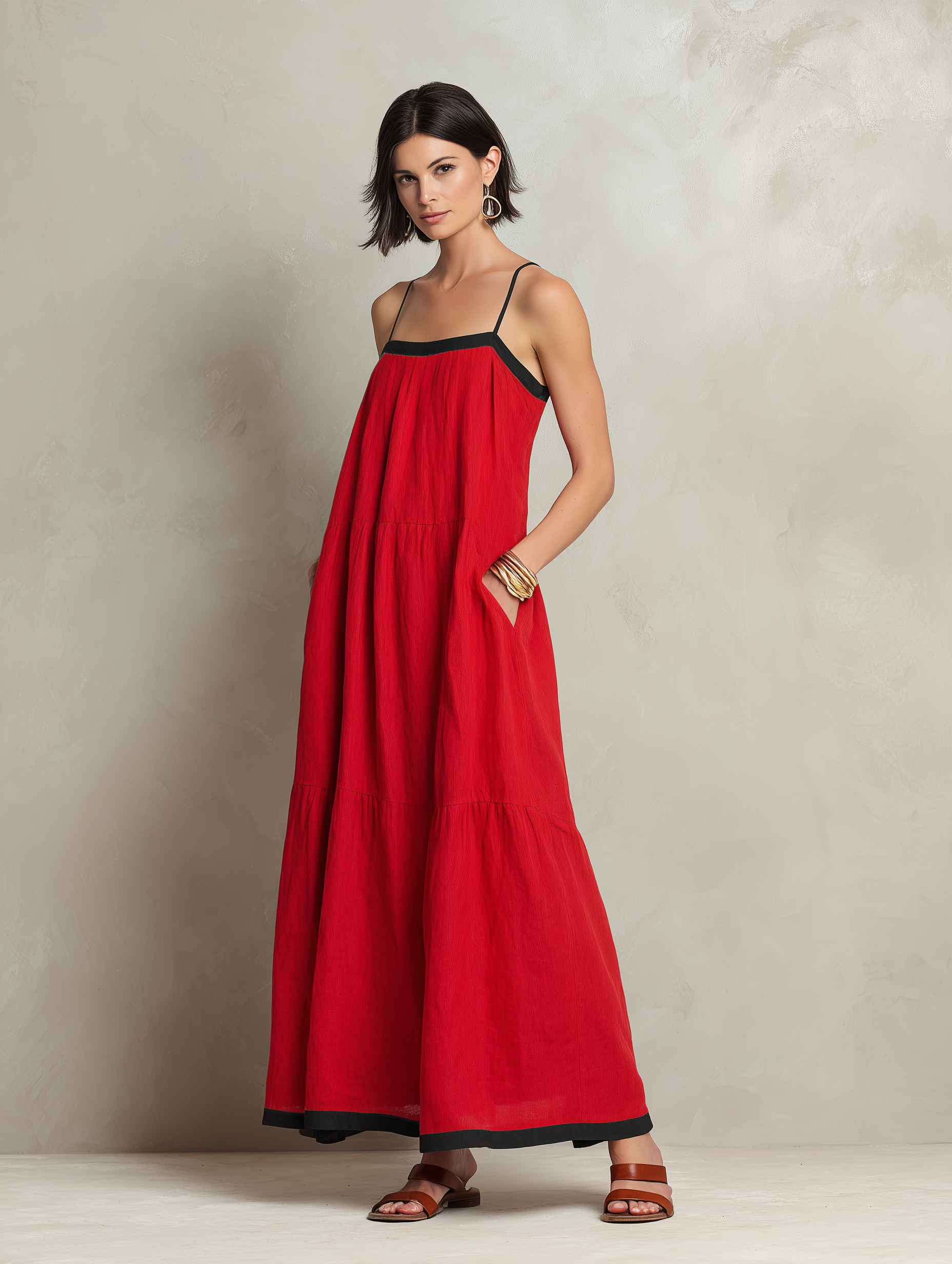 A chic and modern minimalist maxi dress crafted from a lightweight and breathable linen blend. This elegant slip dress features a distinctive color-block design that adds a contemporary flair, creating a sleek, flowing silhouette that offers sophisticated comfort and effortless style for warm-weather occasions.