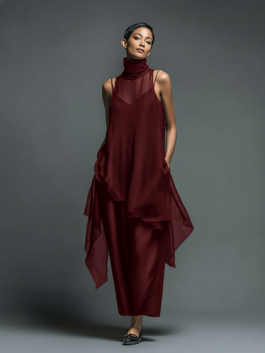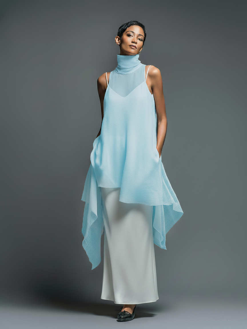 A sophisticated layered maxi dress set featuring a smooth imitation acetate slip dress paired with a sheer chiffon overlay, creating an elegant, flowing minimalist look.