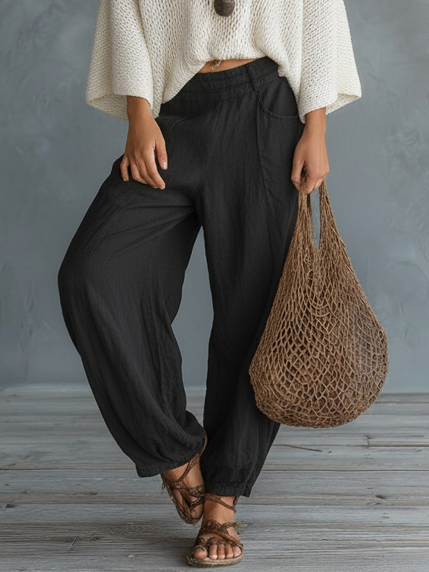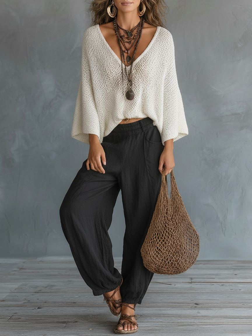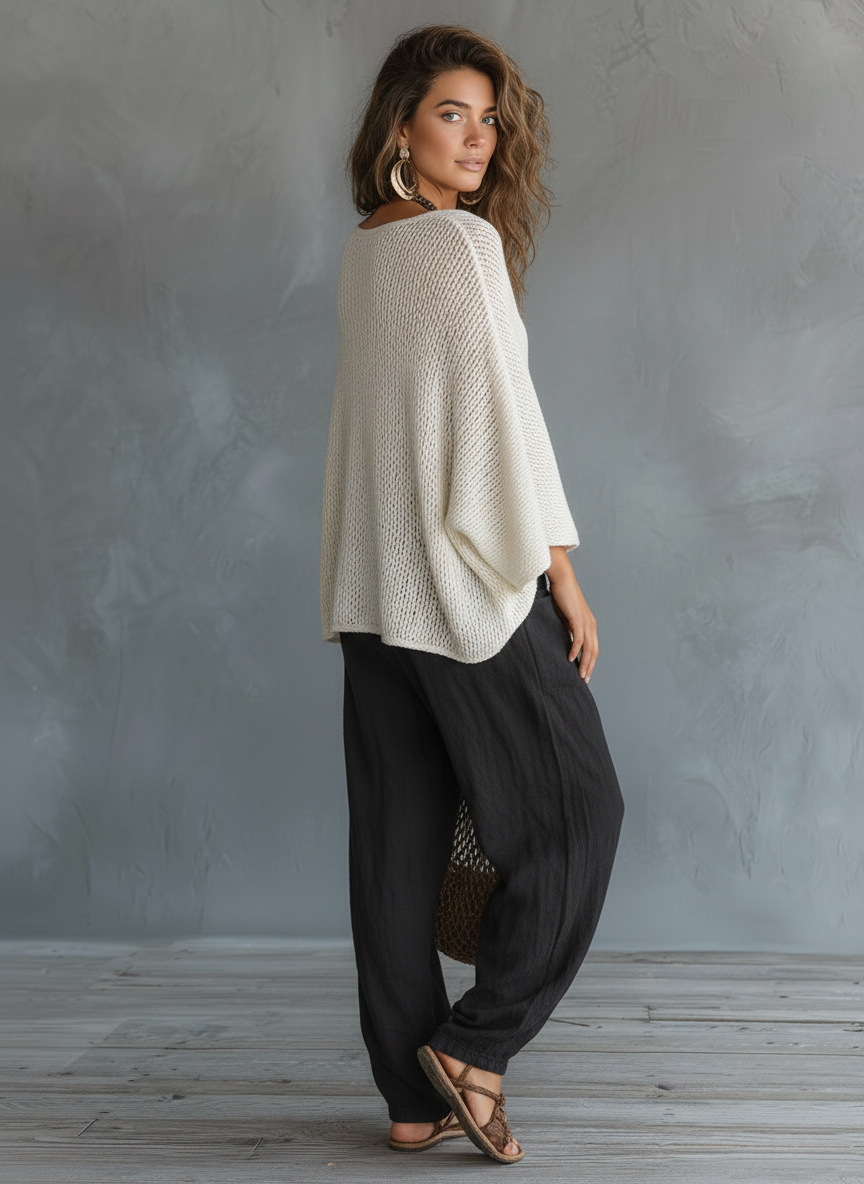 A relaxed minimalist two-piece set featuring a lightweight cape-sleeved sweater paired with harem pants for effortless comfort and modern style.
