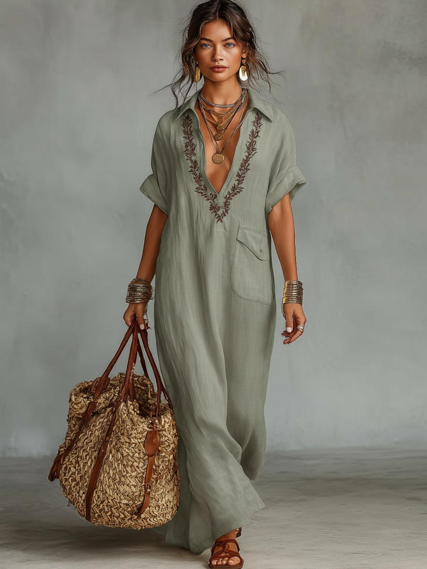 Product Name: Women’s Minimalist Linen Blend Embroidered Short-sleeved Shirt Maxi Dress