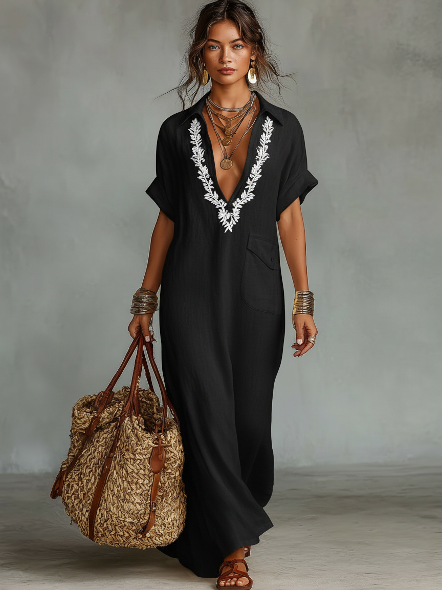 A lightweight linen blend maxi dress featuring delicate embroidered details and a classic short-sleeved shirt design, blending comfort with understated elegance.