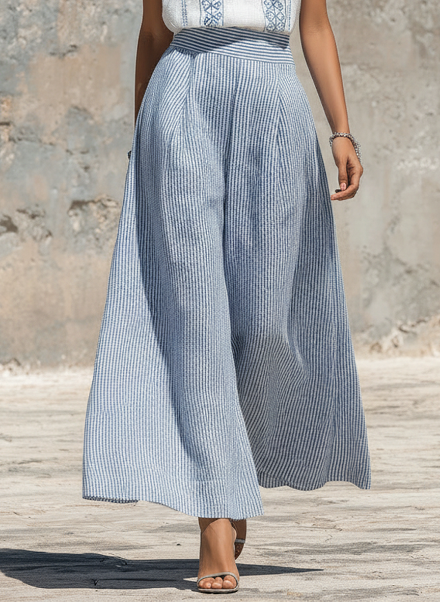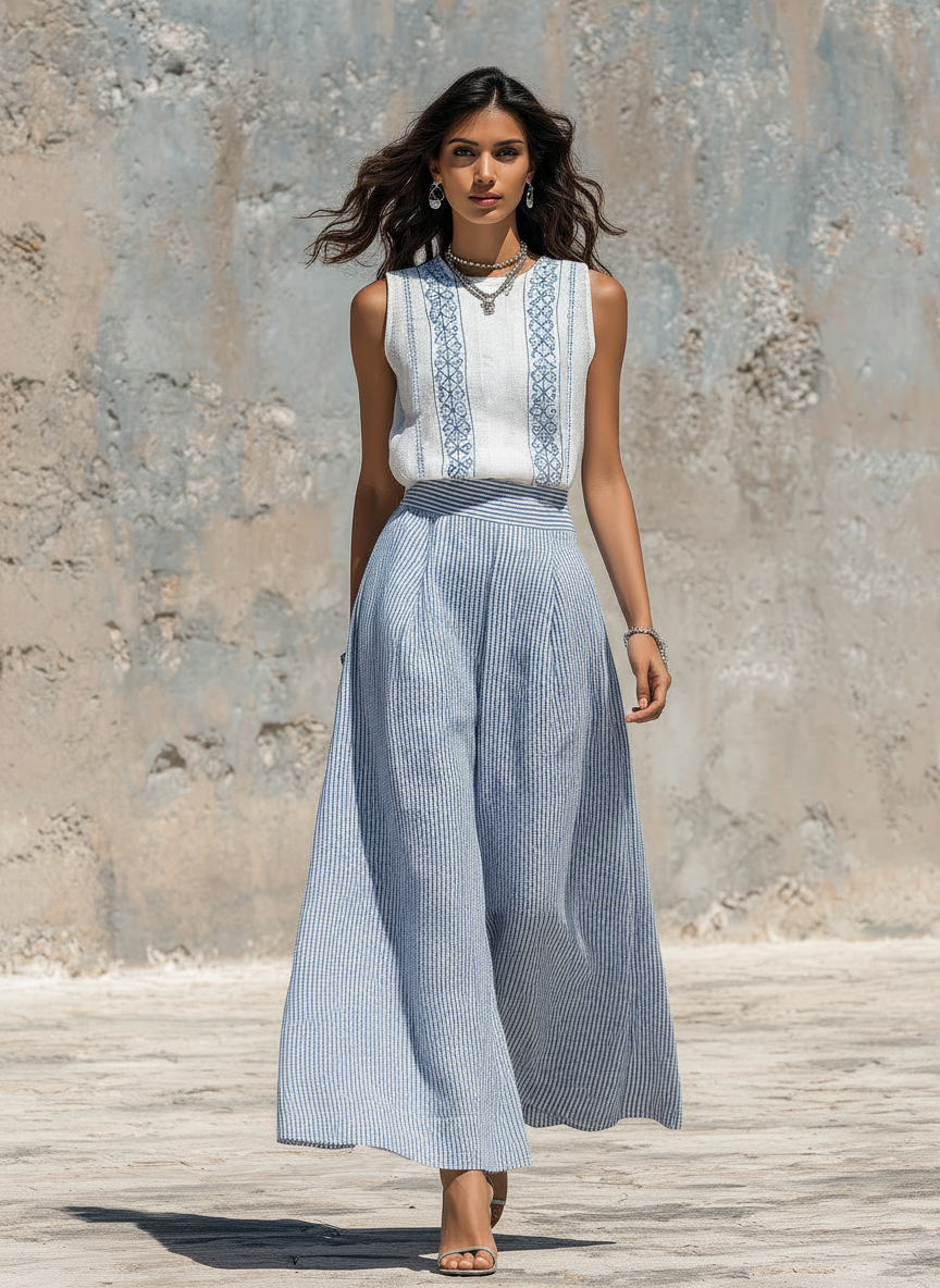 A chic and refined minimalist matching set crafted from a lightweight and breathable linen blend. This sophisticated ensemble features a stylish sleeveless blouse adorned with delicate embroidered details, perfectly paired with comfortable and elegantly flowing striped wide-leg pants. Designed for a polished yet relaxed aesthetic, it offers effortless coordination and comfort for warm-weather days.