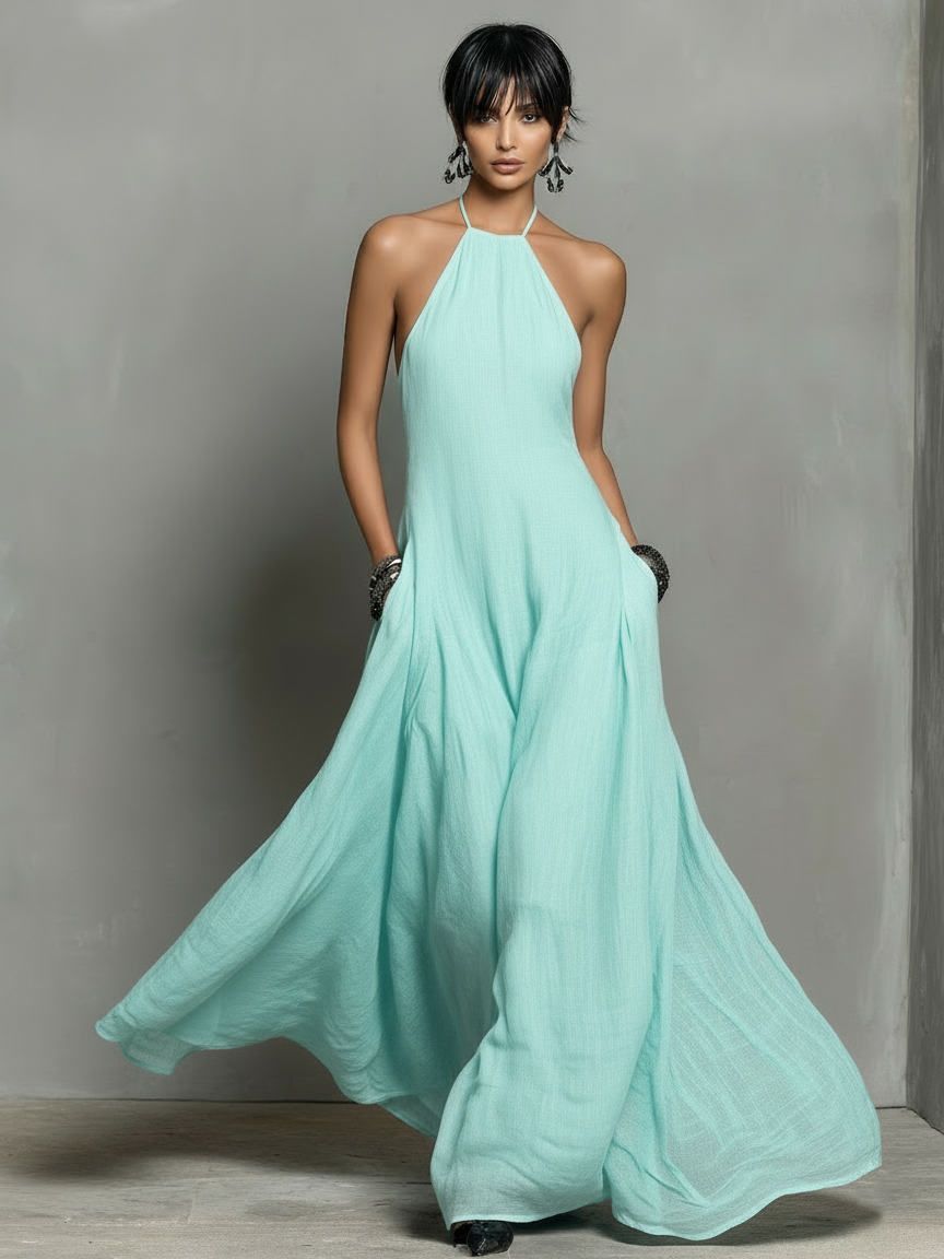A breezy minimalist maxi dress made from a breathable linen blend, featuring a halter neckline and sleeveless silhouette for effortless summer elegance.