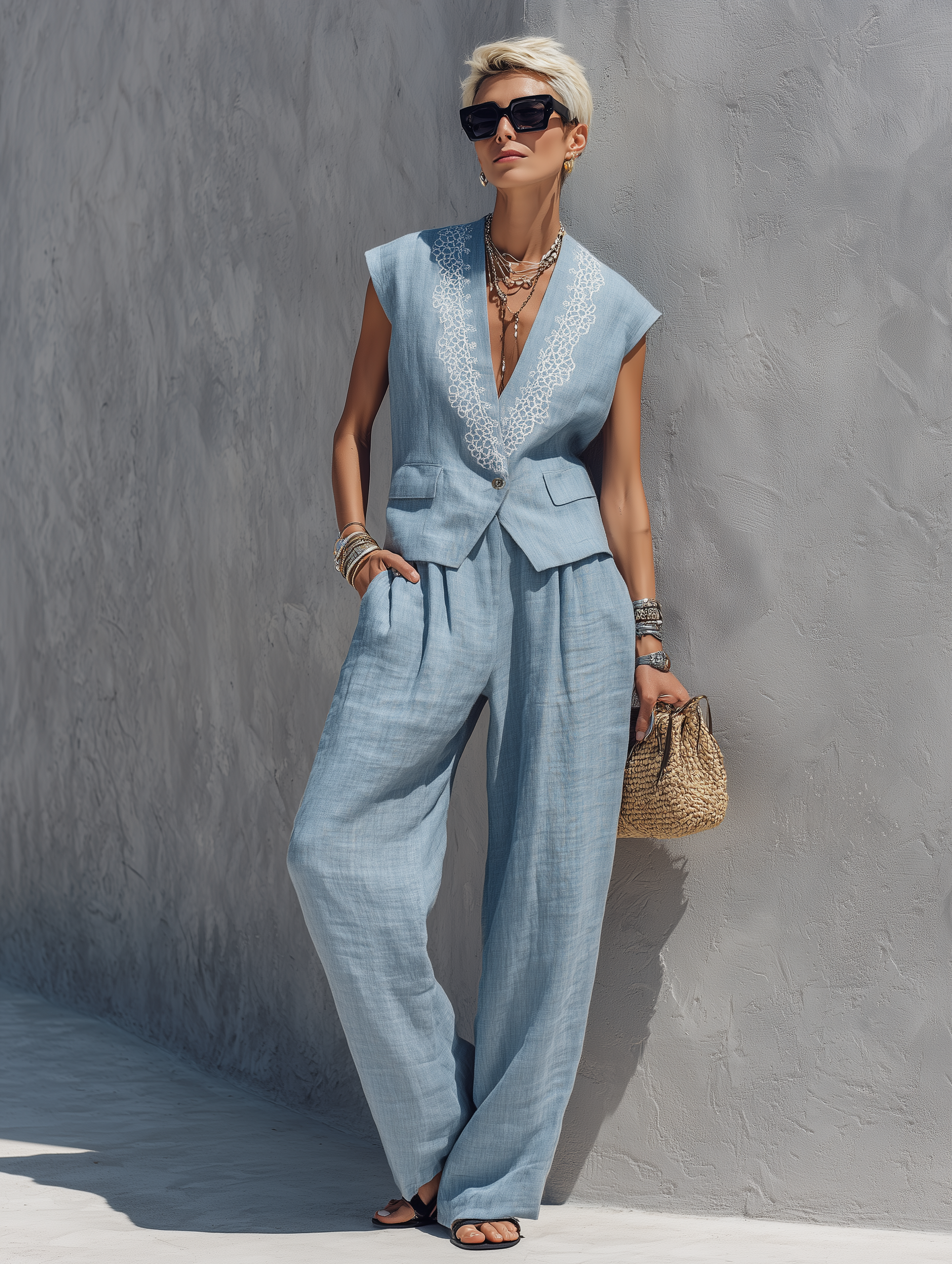 A chic and refined minimalist matching set crafted from a lightweight and breathable linen blend. This sophisticated ensemble features a stylish V-neck sleeveless vest with delicate embroidered details and a single-button closure, perfectly paired with comfortable and elegantly flowing wide-leg trousers. Designed for a polished yet relaxed aesthetic, it offers effortless coordination and comfort for warm-weather days.