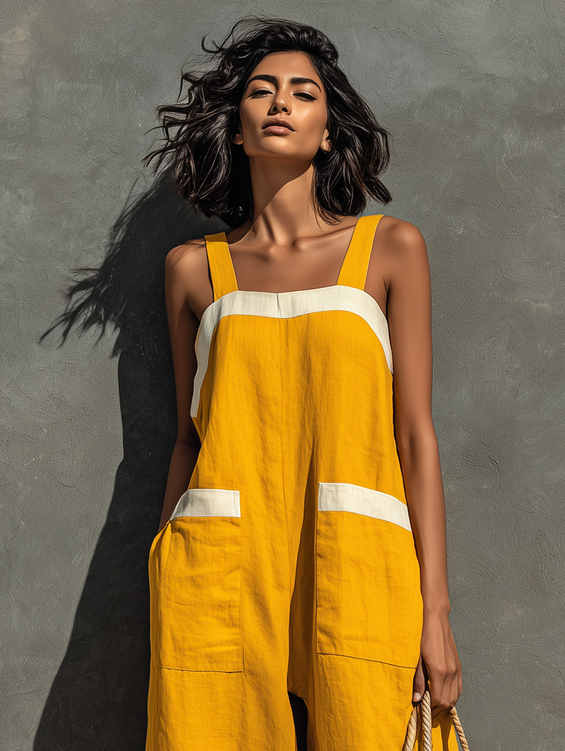 A breezy minimalist jumpsuit crafted from a breathable linen blend, featuring a square neckline and strapless design with a loose-fitting silhouette for effortless summer style.