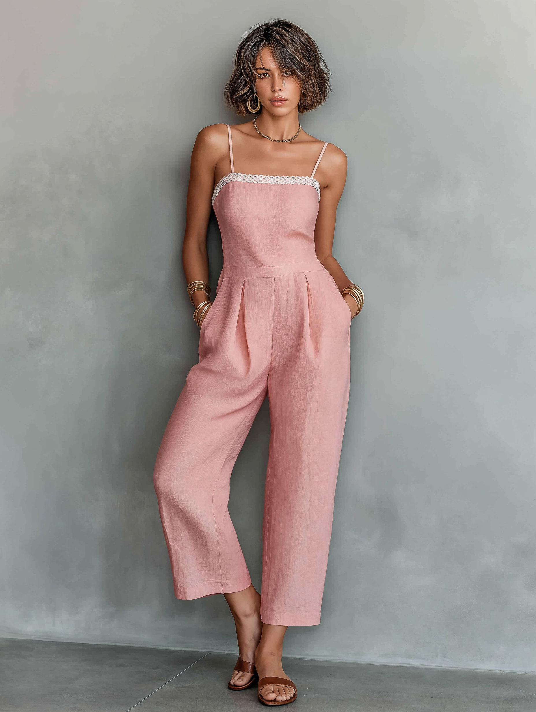 A chic and effortlessly stylish minimalist jumpsuit crafted from a lightweight and breathable linen blend. This versatile one-piece features delicate strappy shoulders for a sleek silhouette and fashionable straight-leg cropped pants, offering sophisticated comfort and modern appeal perfect for warm-weather occasions.