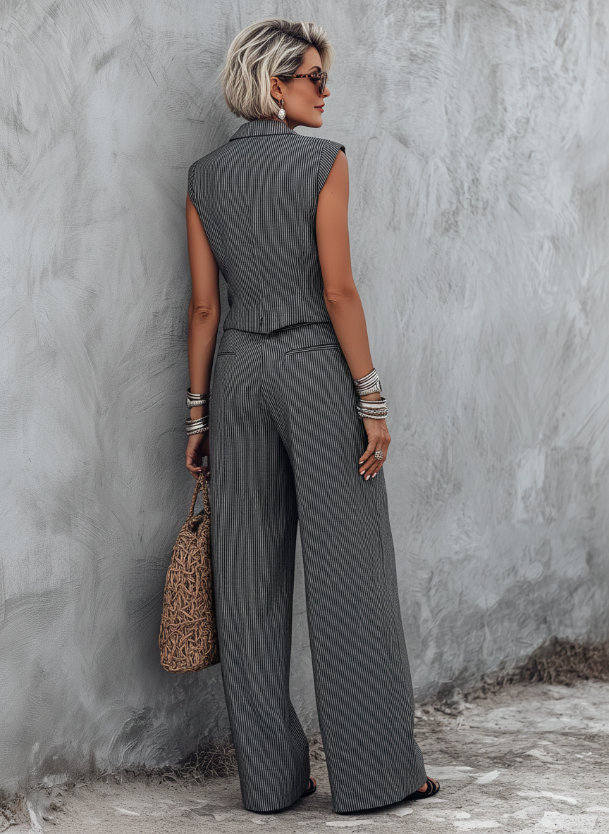 Product Name: Women's Minimalist Linen-Blend Striped Lapel Vest & Wide-Leg Pants Set