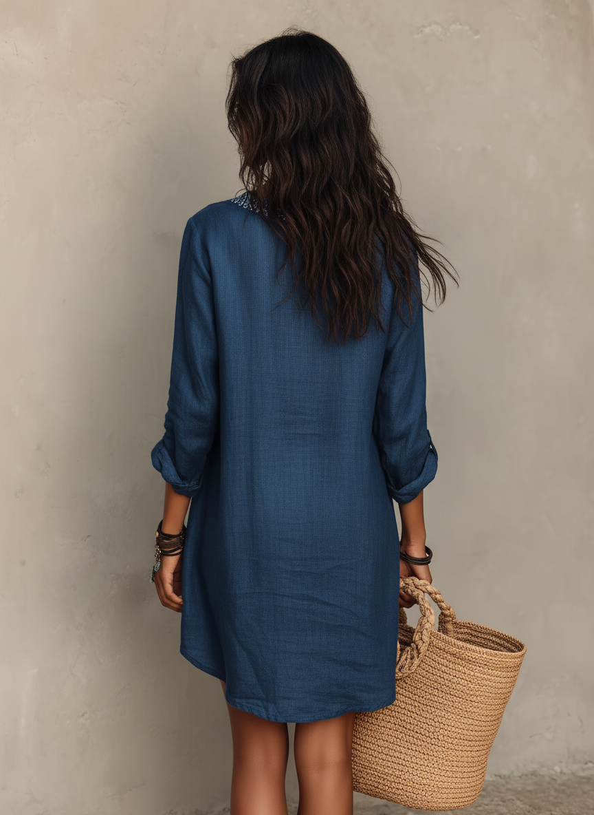 Product Name: Women's Minimalist Linen-Blend V-Neck Embroidered Long-Sleeve Mini Dress