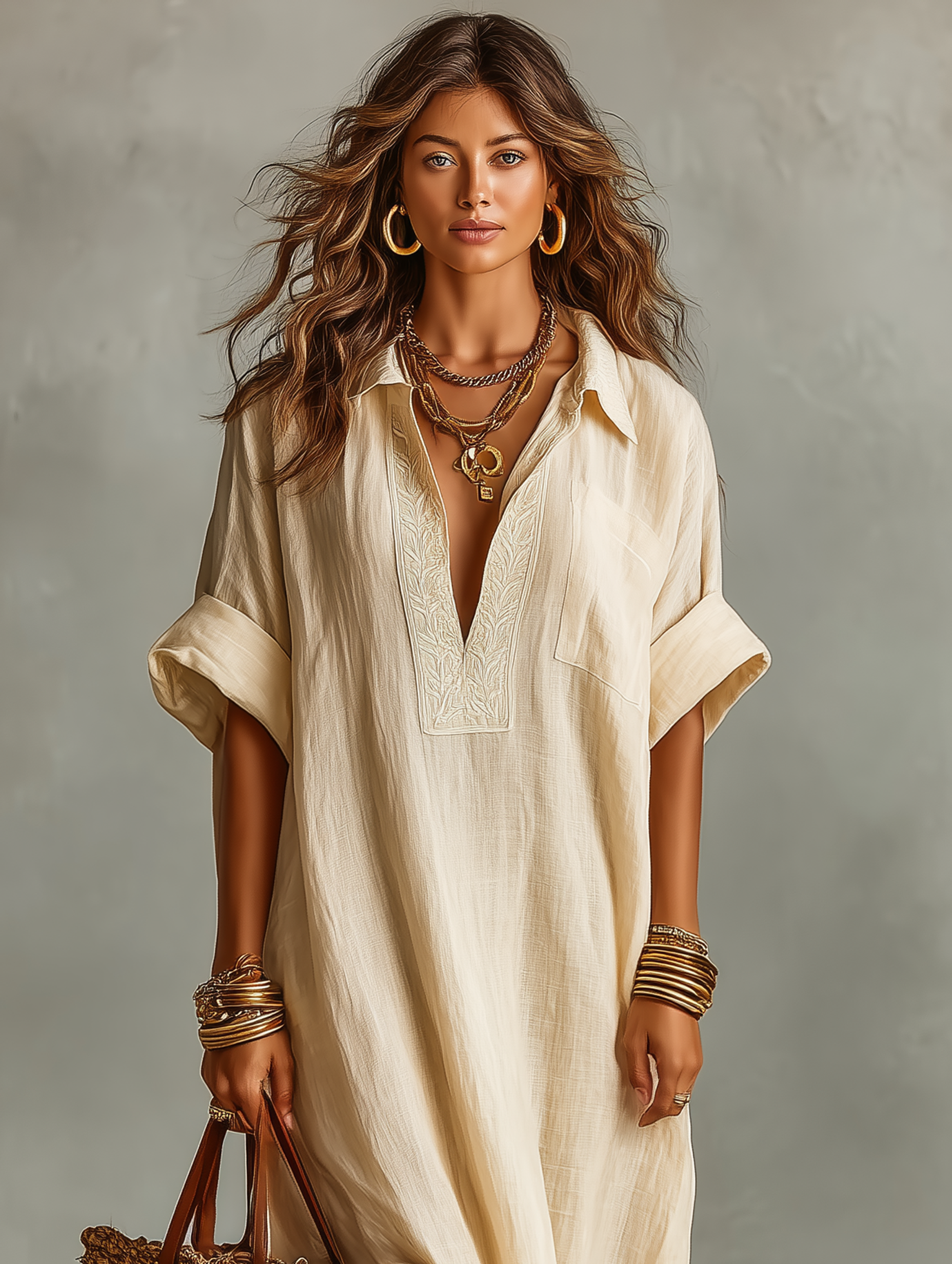 A relaxed maxi dress featuring delicate embroidered details and a loose-fitting silhouette, designed for effortless comfort with minimalist elegance.