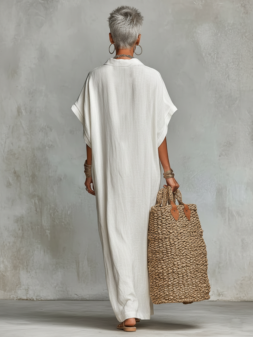 A clean, minimalist shirt-style maxi dress with a relaxed silhouette, offering effortless elegance and all-day comfort.