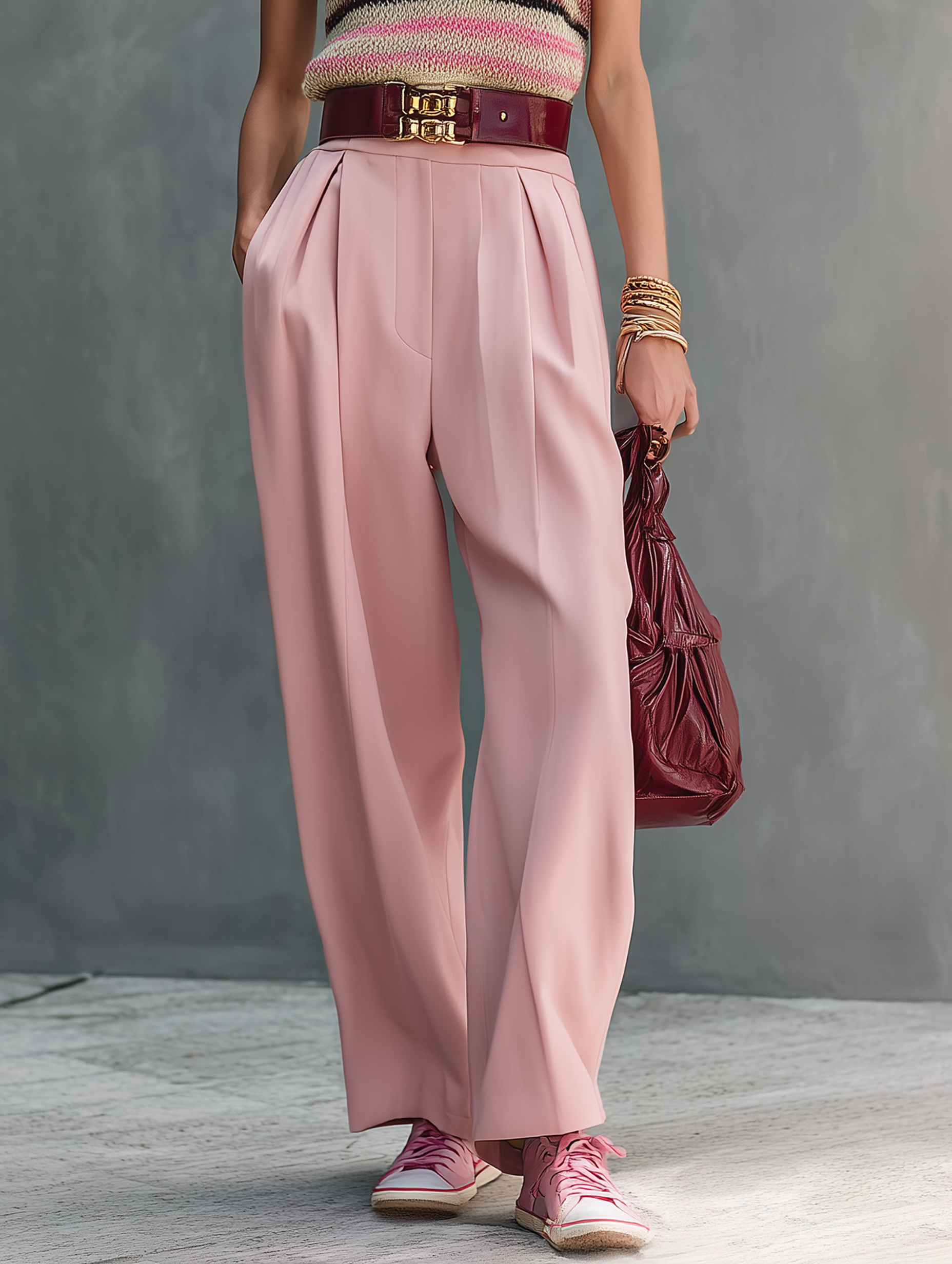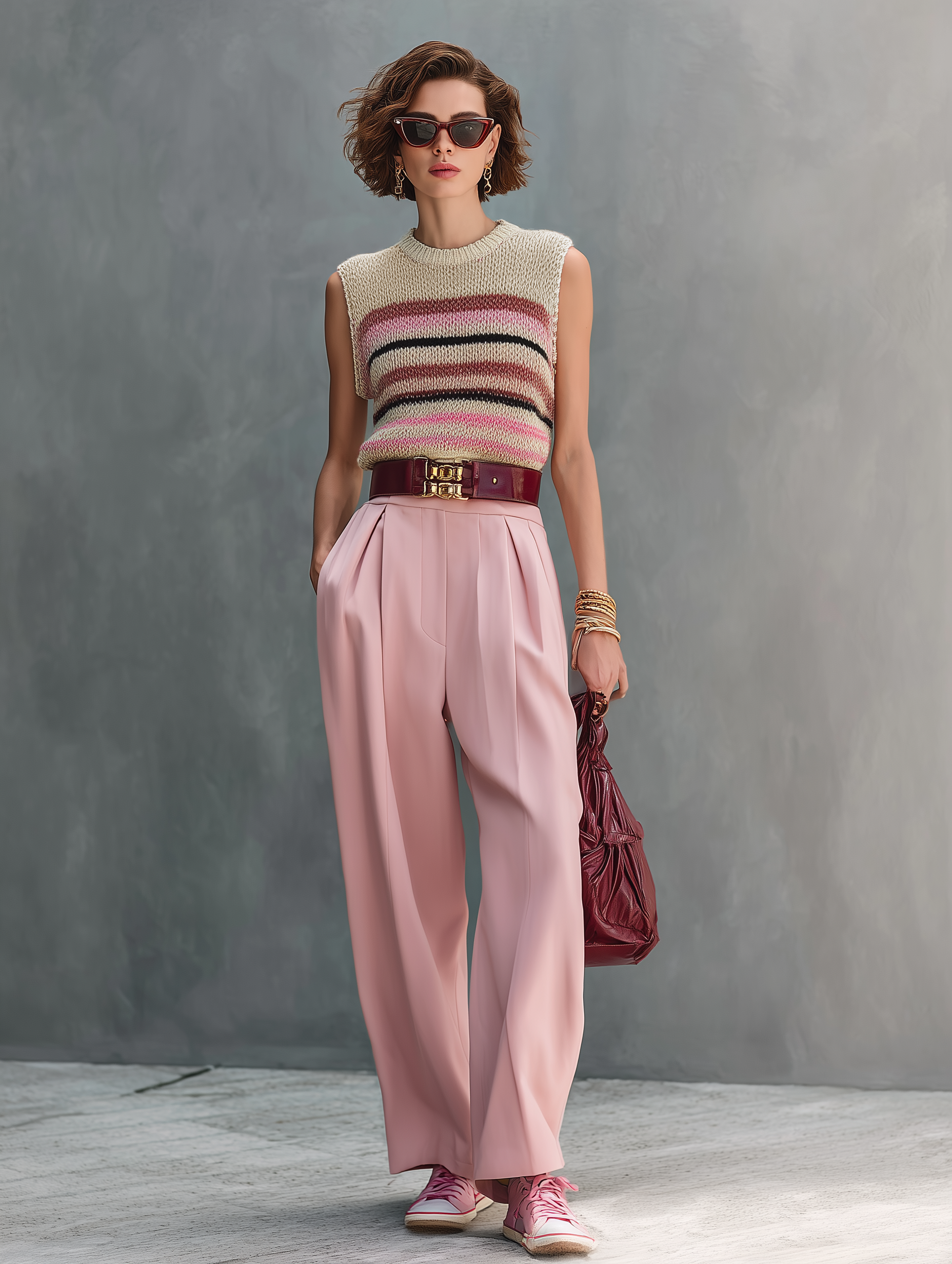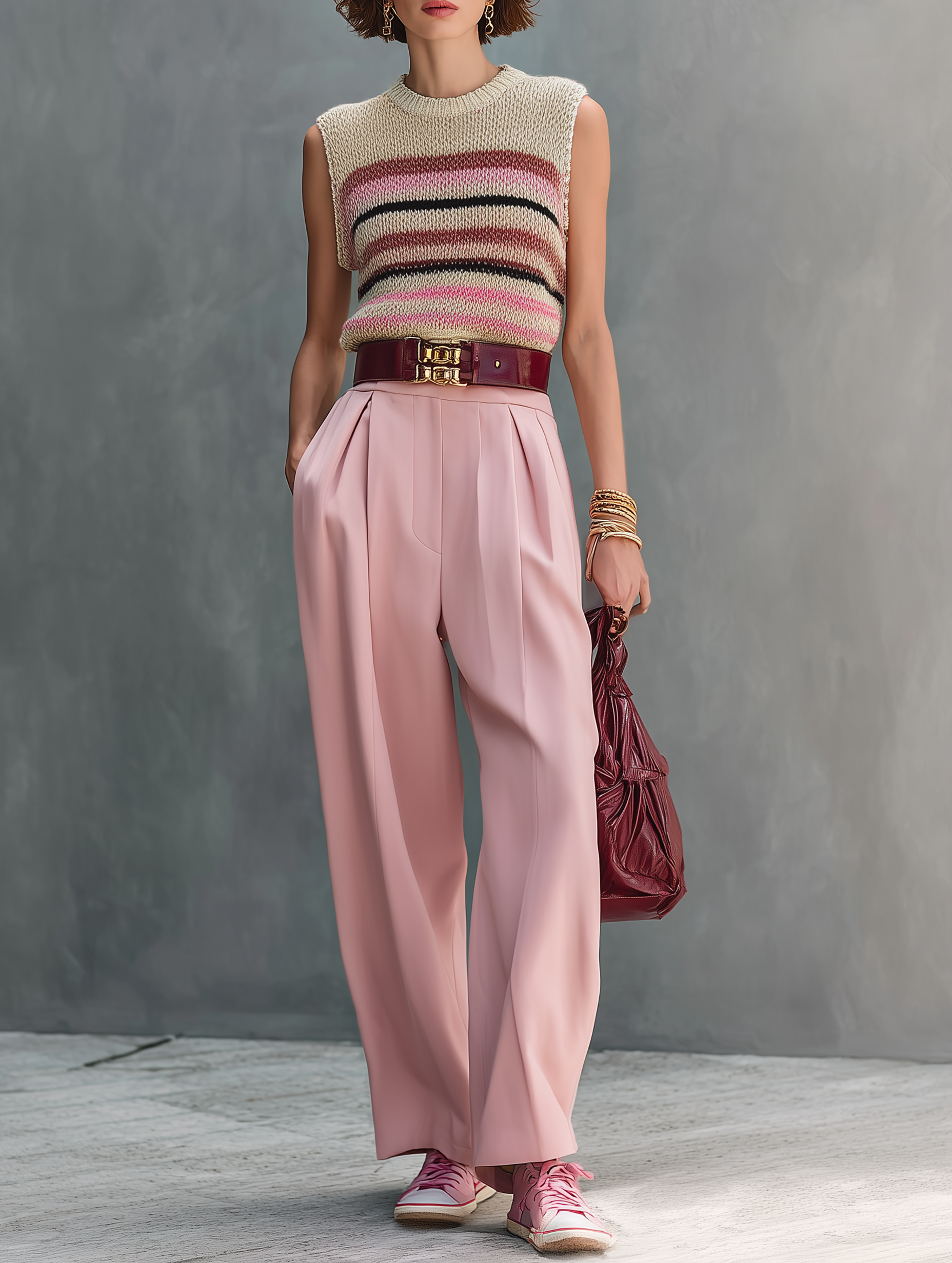 Pair the set with sleek white sneakers and a minimalist tote bag for a casual yet polished daytime look. Elevate it with flat sandals or mules and delicate layered jewelry for a stylish brunch or a casual evening gathering. The sweater can be styled with denim, and the pants with a crisp blouse for diverse outfits.