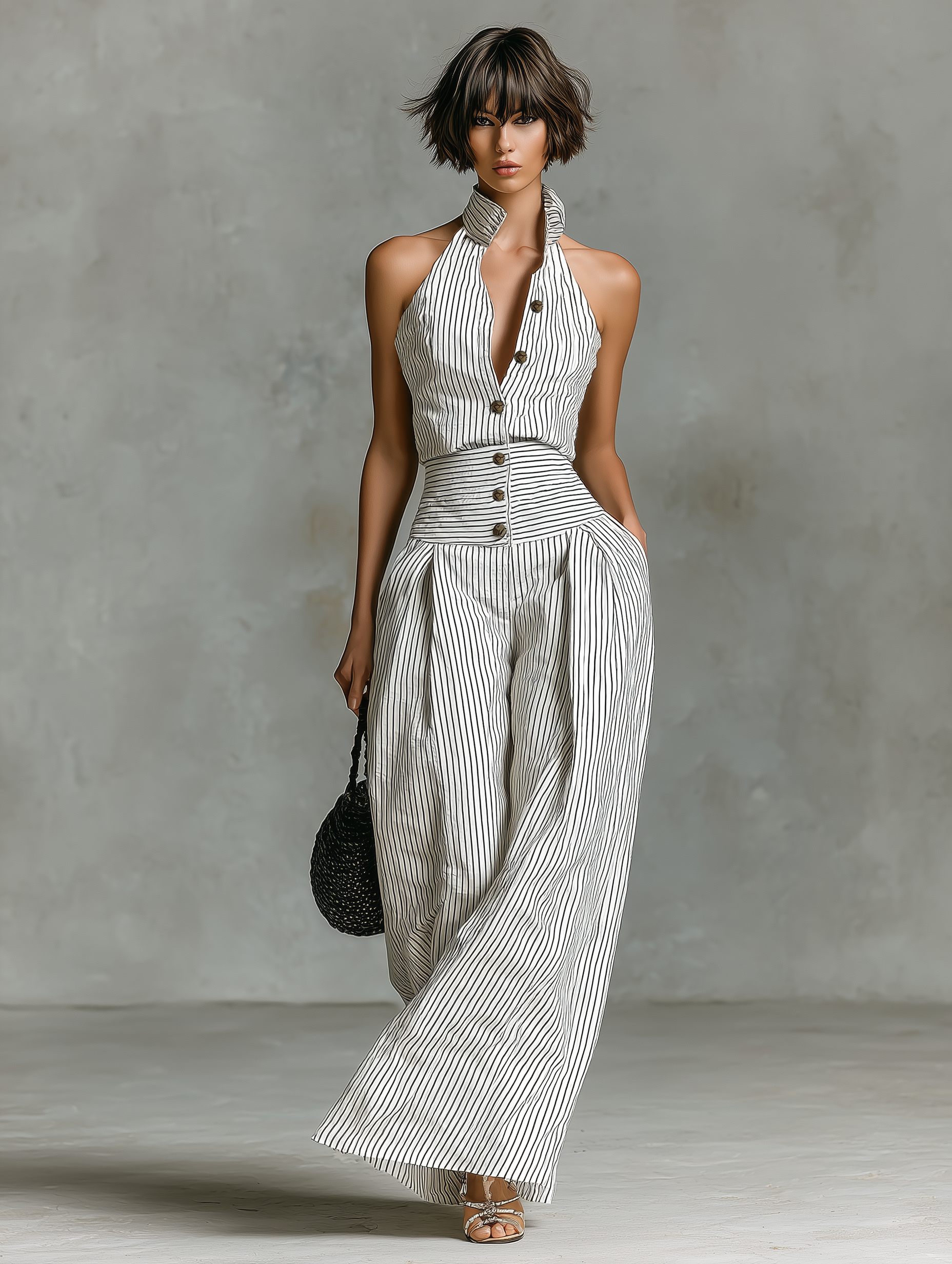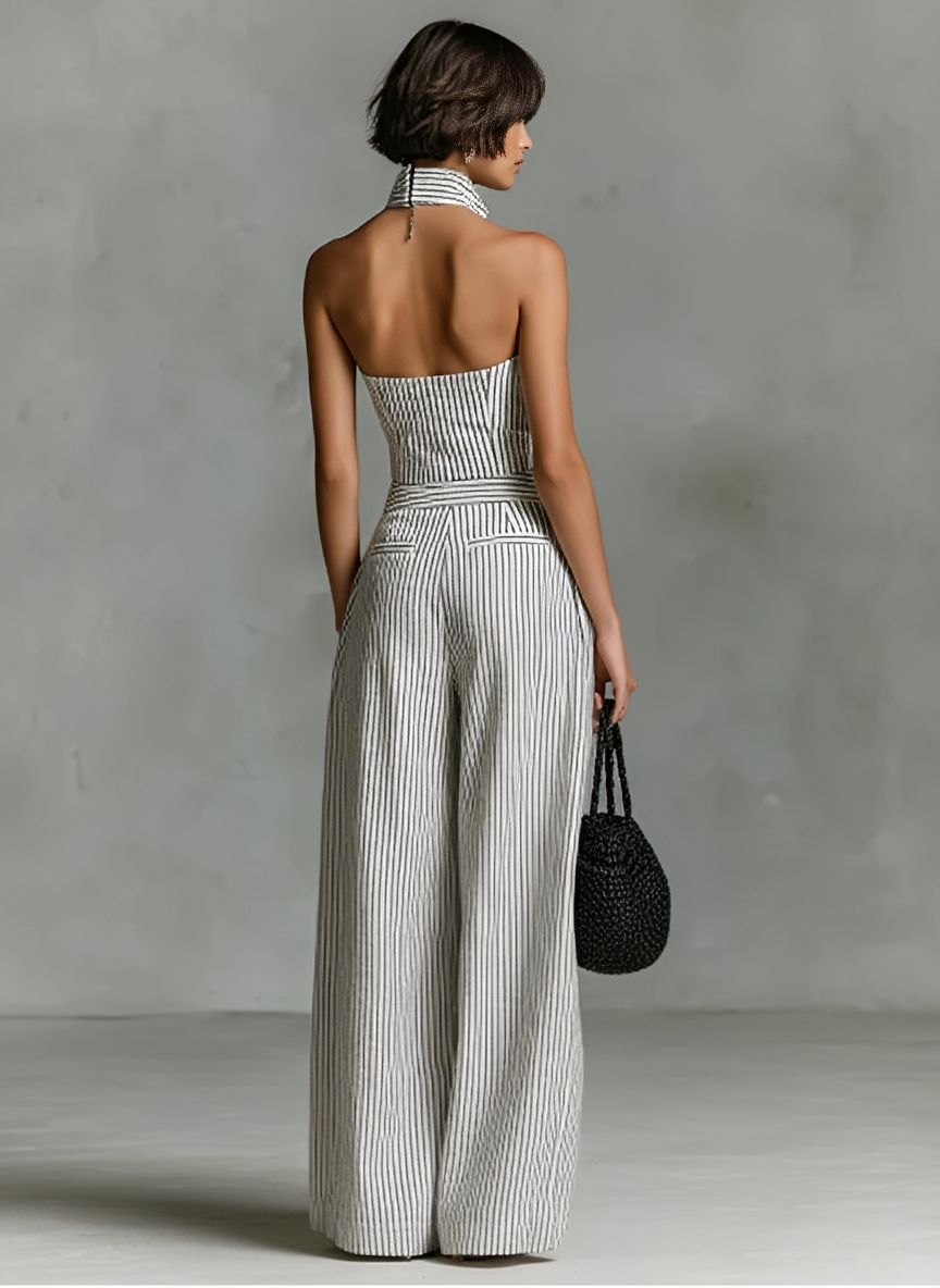 A chic and refined minimalist jumpsuit crafted from breathable linen, featuring a timeless striped pattern that adds classic appeal. This single-breasted, sleeveless design offers a sleek and modern silhouette, blending lightweight comfort with sophisticated style for a versatile one-piece ensemble.