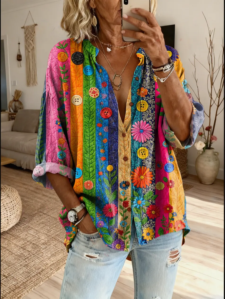 Women's Multicolor Vertical Stripe Button-down Daisy Print Artistic Casual Cotton-linen Blend Shirt