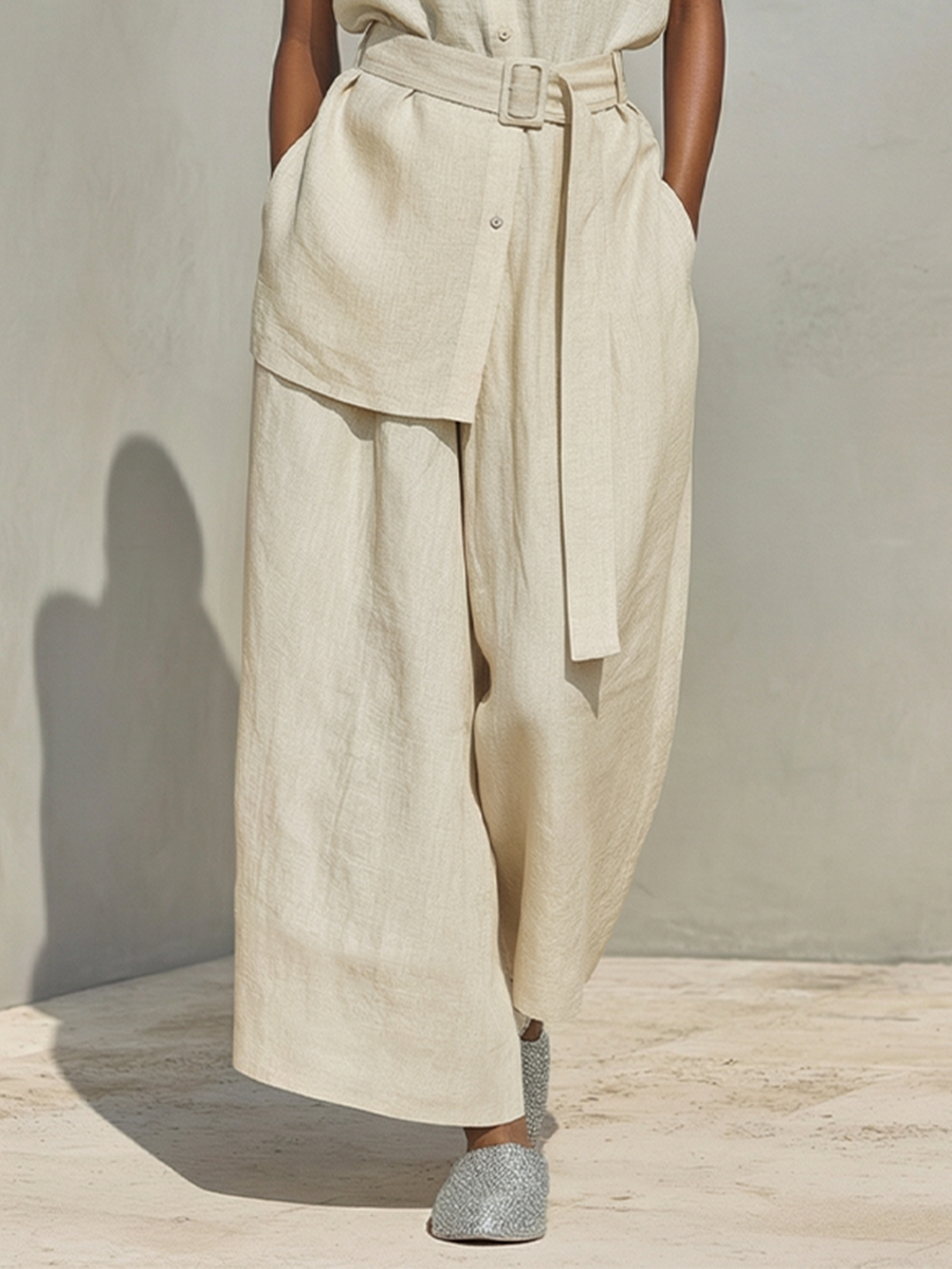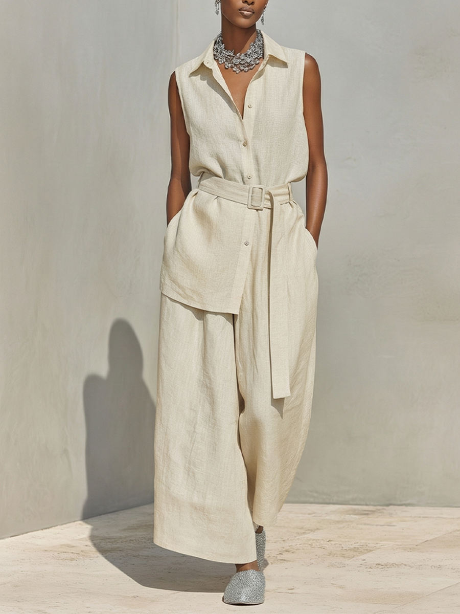 Women's Oatmeal Linen Two-Piece Set With Sleeveless Button-Down Shirt & High-Waisted Wide-Leg Pants, Timeless Minimalist-Resort Style Set