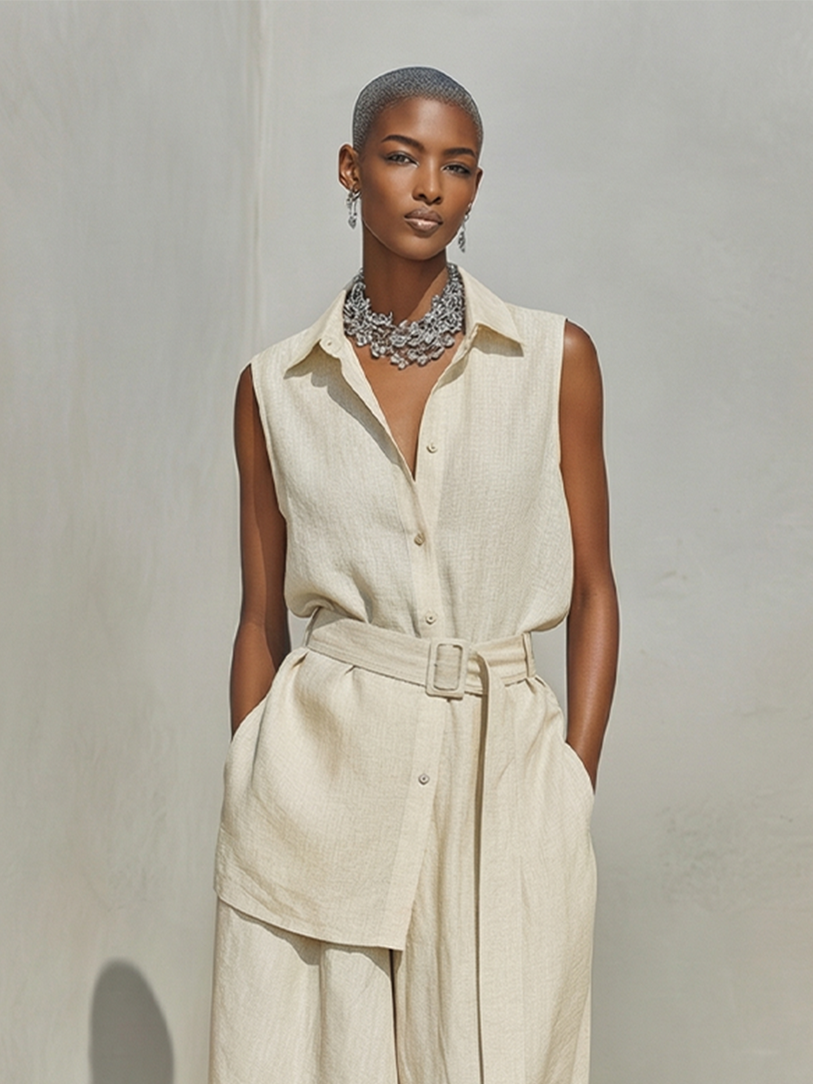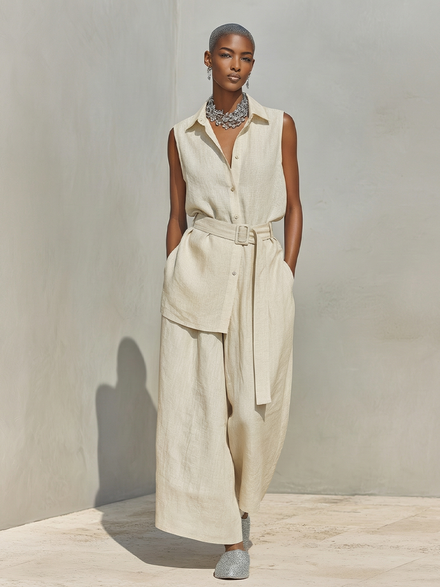 This oatmeal linen two-piece set features a sleeveless button-down shirt paired with high-waisted wide-leg pants for a relaxed yet refined look. Its natural tone and breathable fabric make it perfect for warm days and effortless resort style.