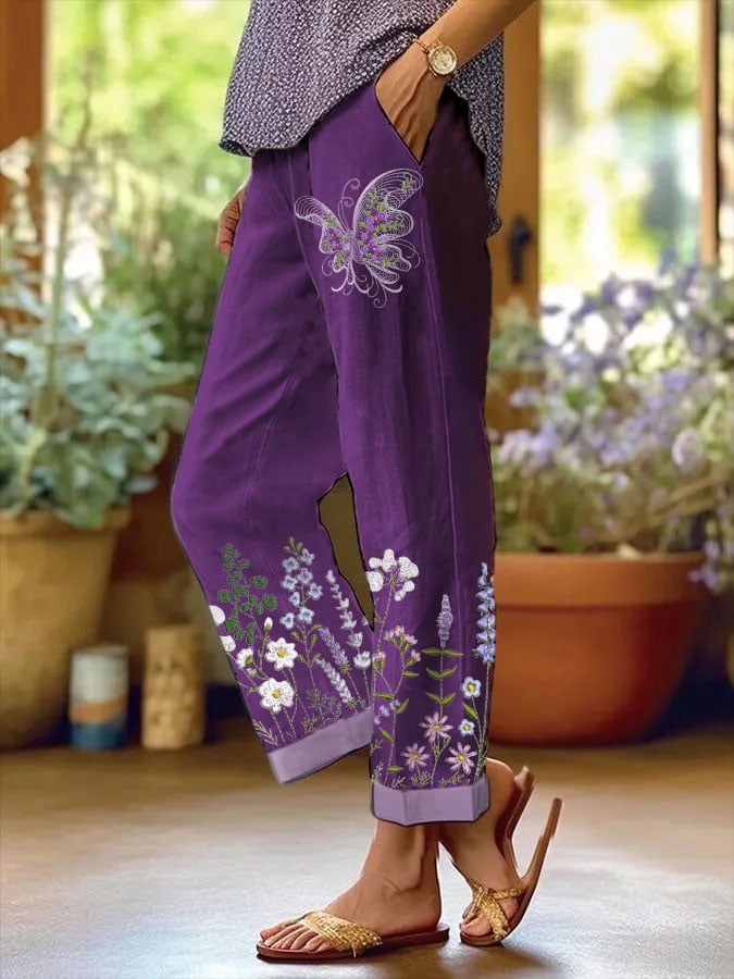 Women's Purple Flower And Butterfly Alzheimer's Awareness Support Casual Pants