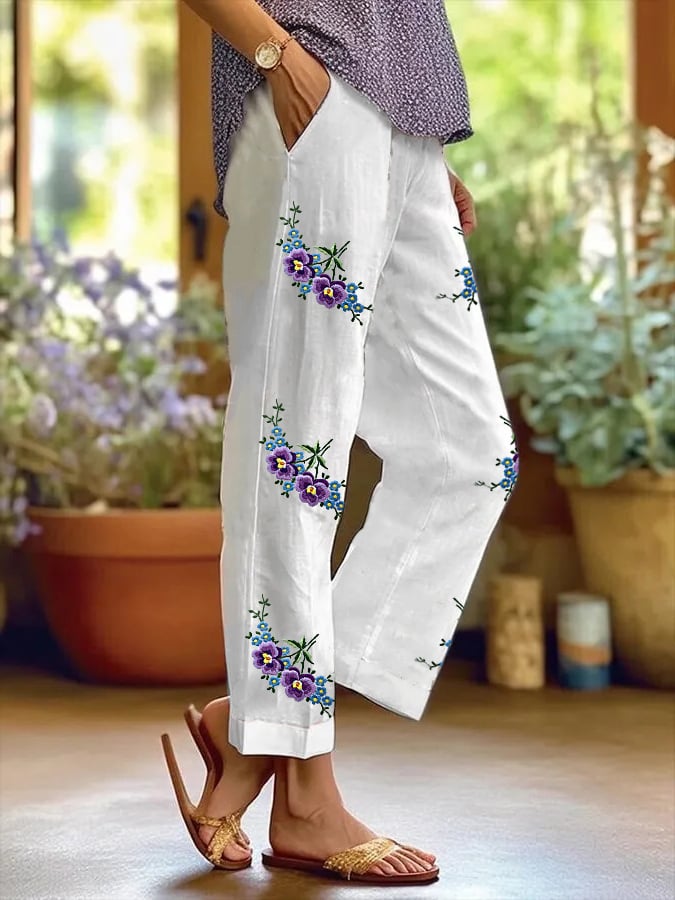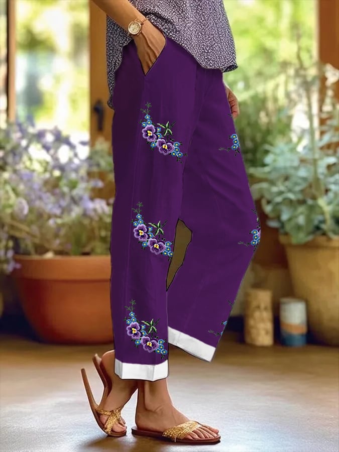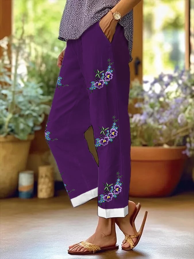 Women's Purple Flower Print Alzheimer's Awareness Support Casual Pants