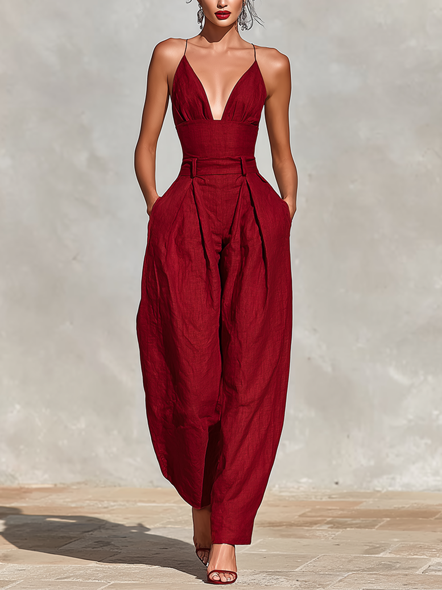 Women’s Red Linen Jumpsuit With Spaghetti Straps & High-Waisted Pleated Pants, Timeless Romantic-Elegant Style Jumpsuit
