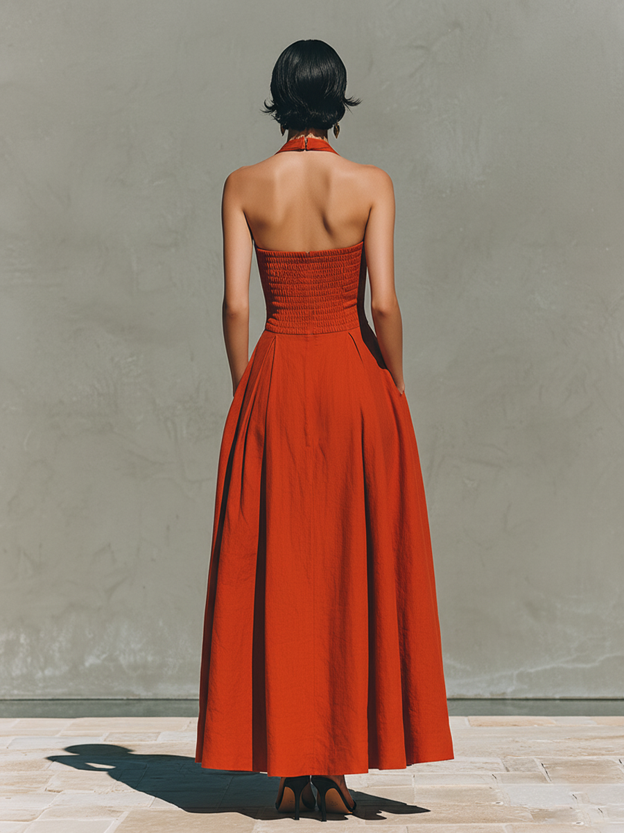 This Women’s Red Linen Maxi Dress Is Designed For A Breezy, Elegant Look. The Halter Neck And Pleated Skirt Create A Timeless Resort Style.