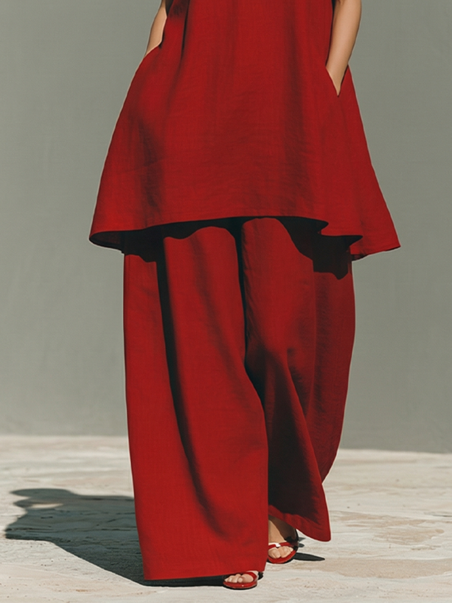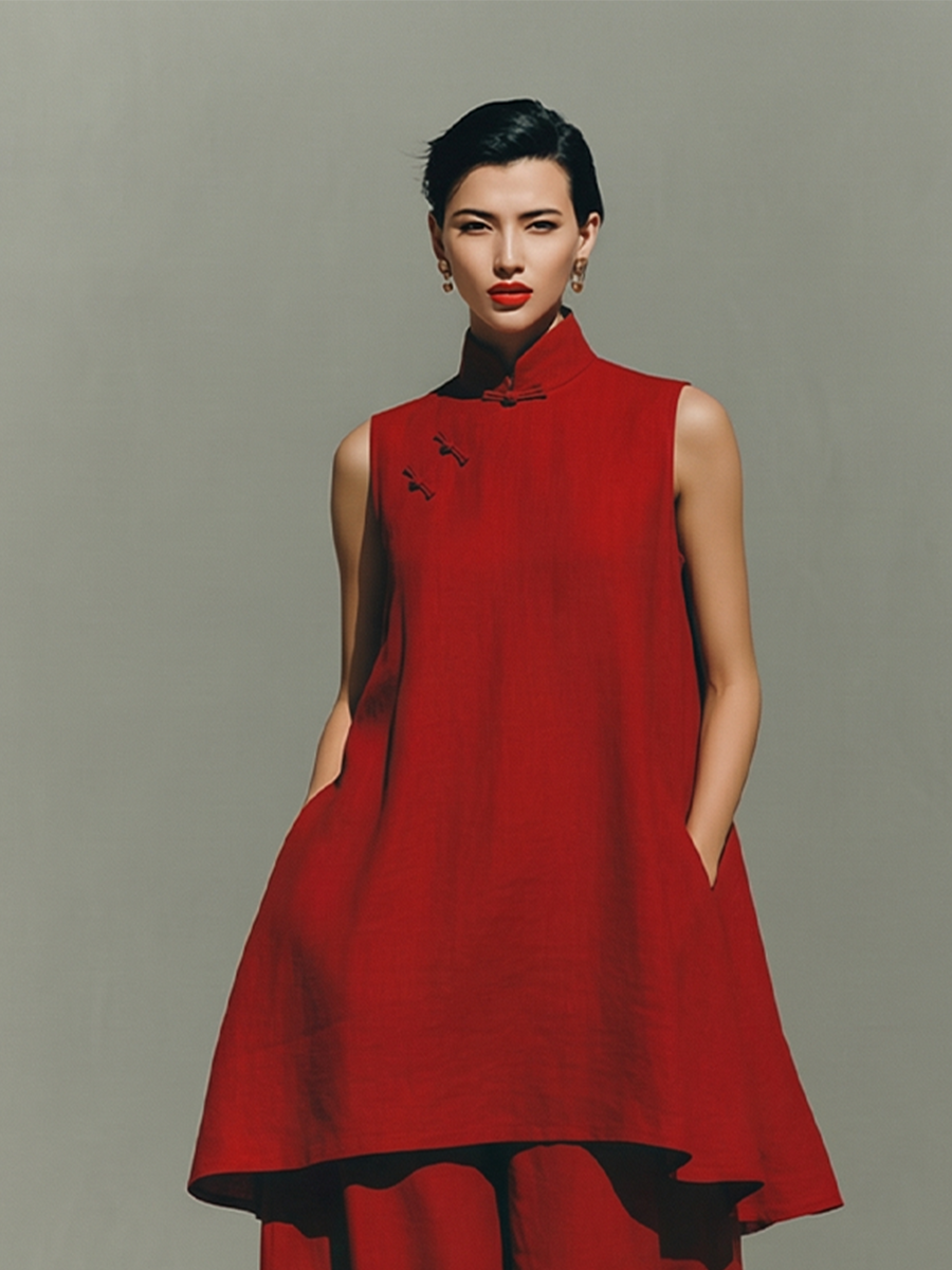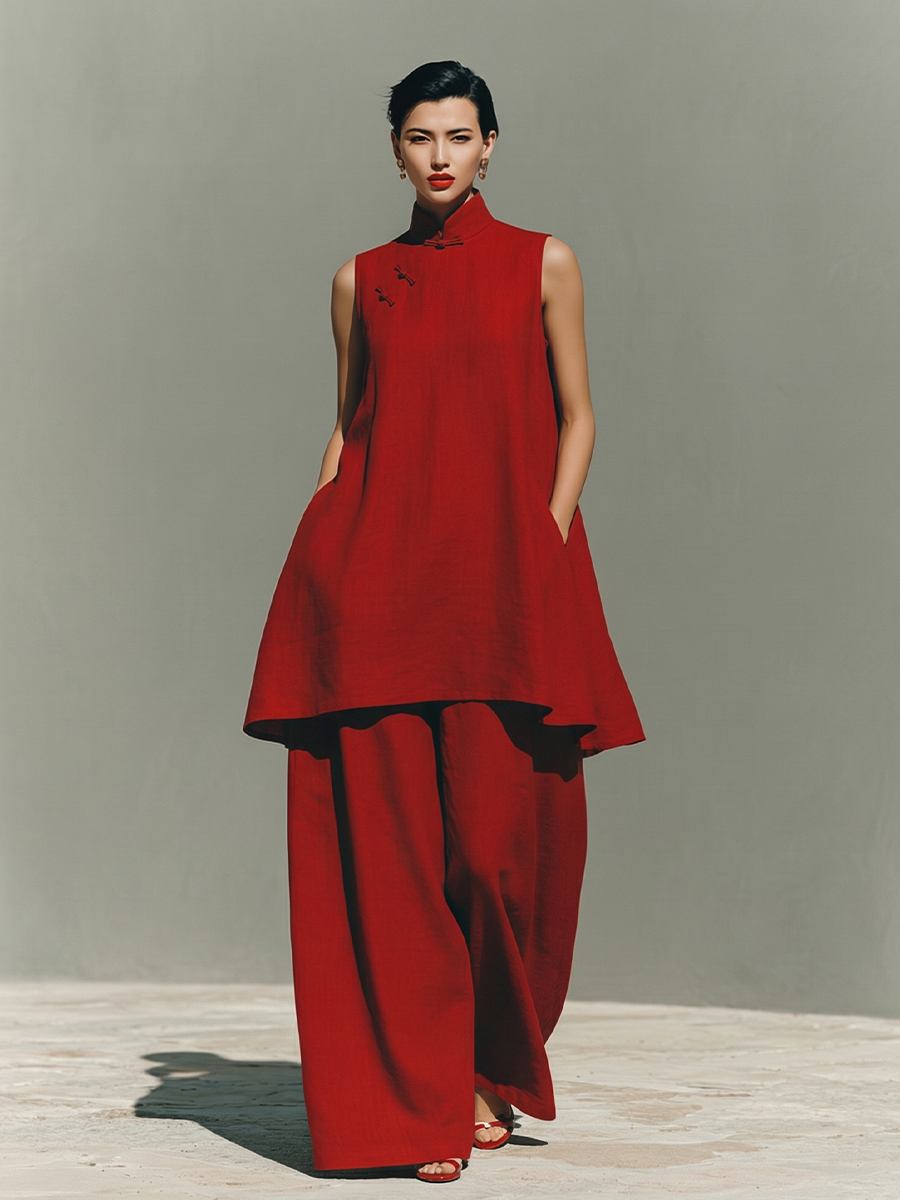 A red linen two-piece set with a mandarin collar and frog button detail. Modern and minimalist for a clean, elegant daily look.