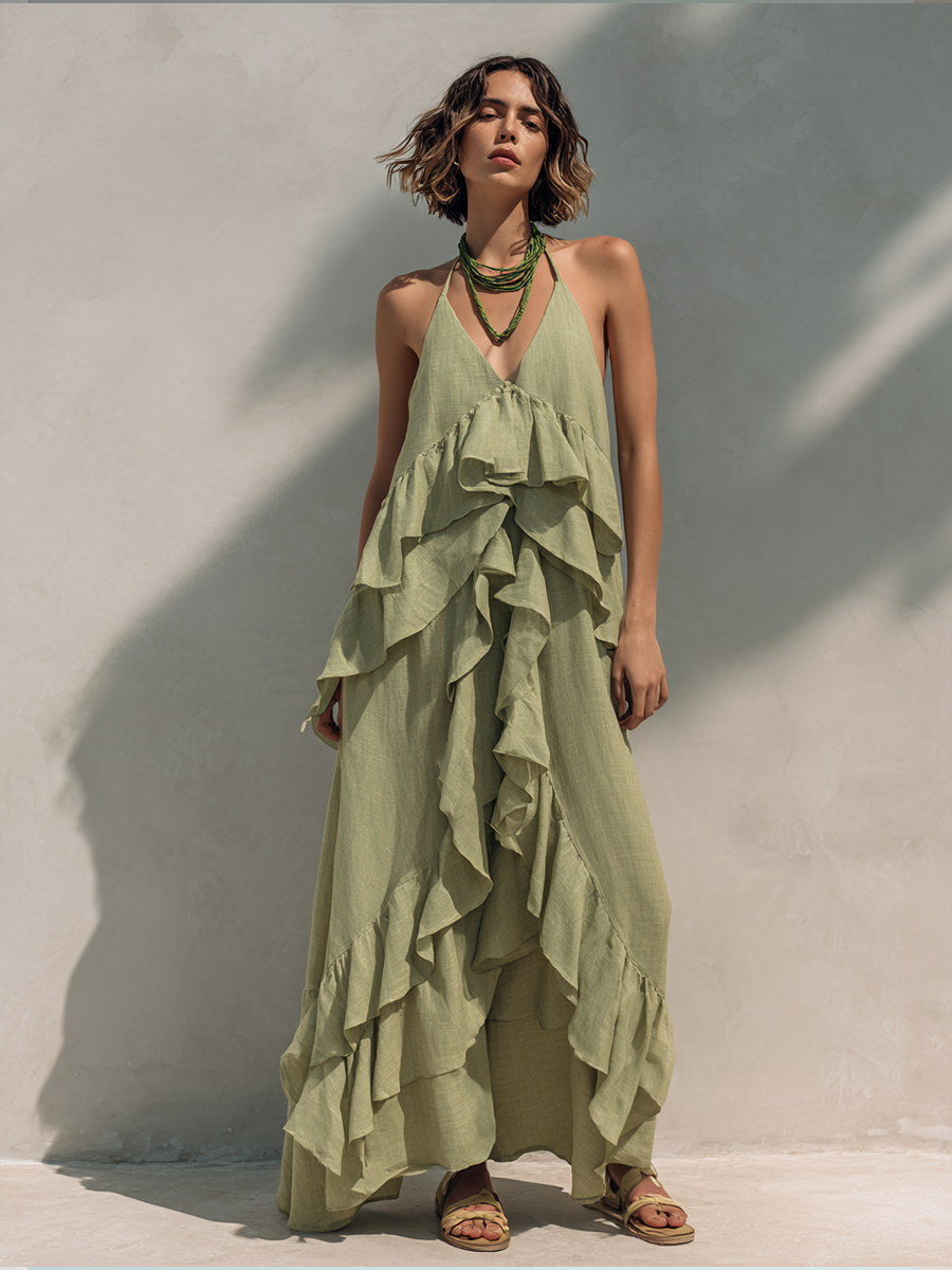 This light green maxi dress combines breezy resort elegance with artisanal texture—featuring an irregular ruffled hem, sleeveless silhouette, and effortless cotton linen drape.