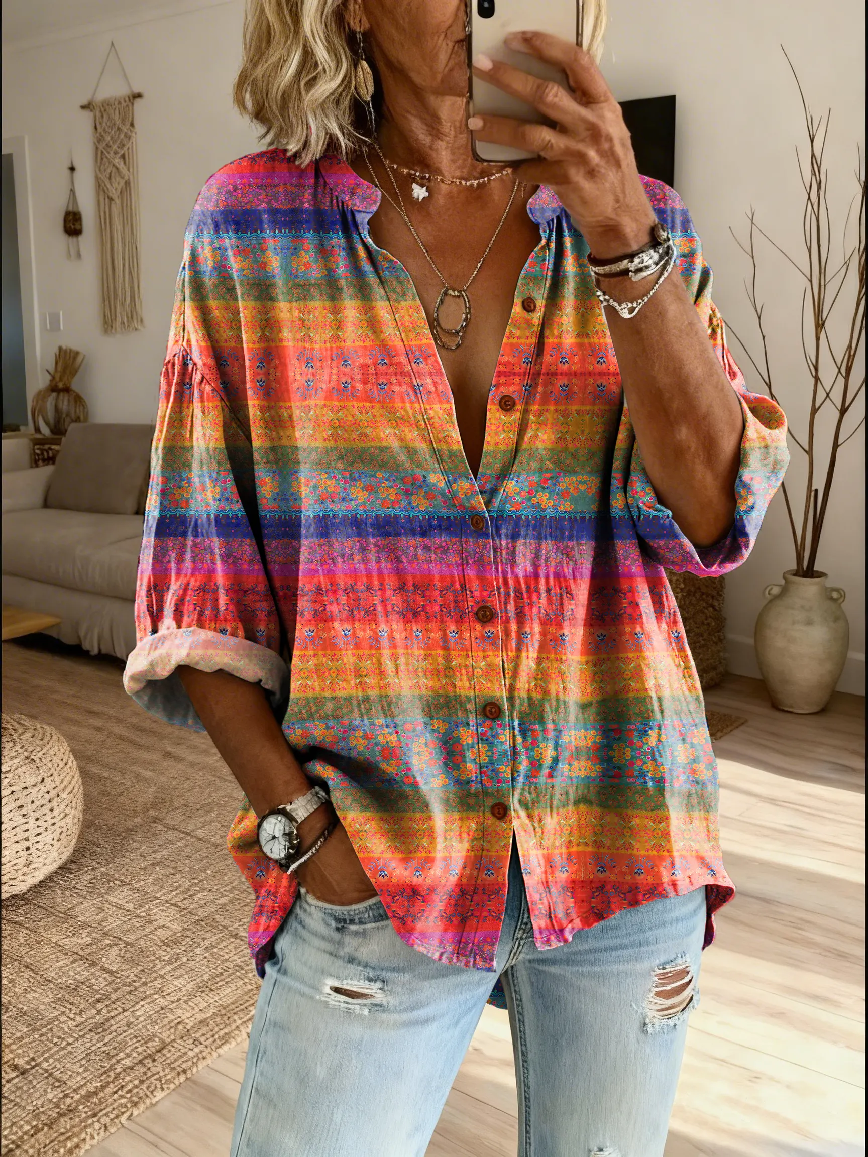 Women's Retro Colorful Striped Floral Art Print Casual Cotton Linen Shirt